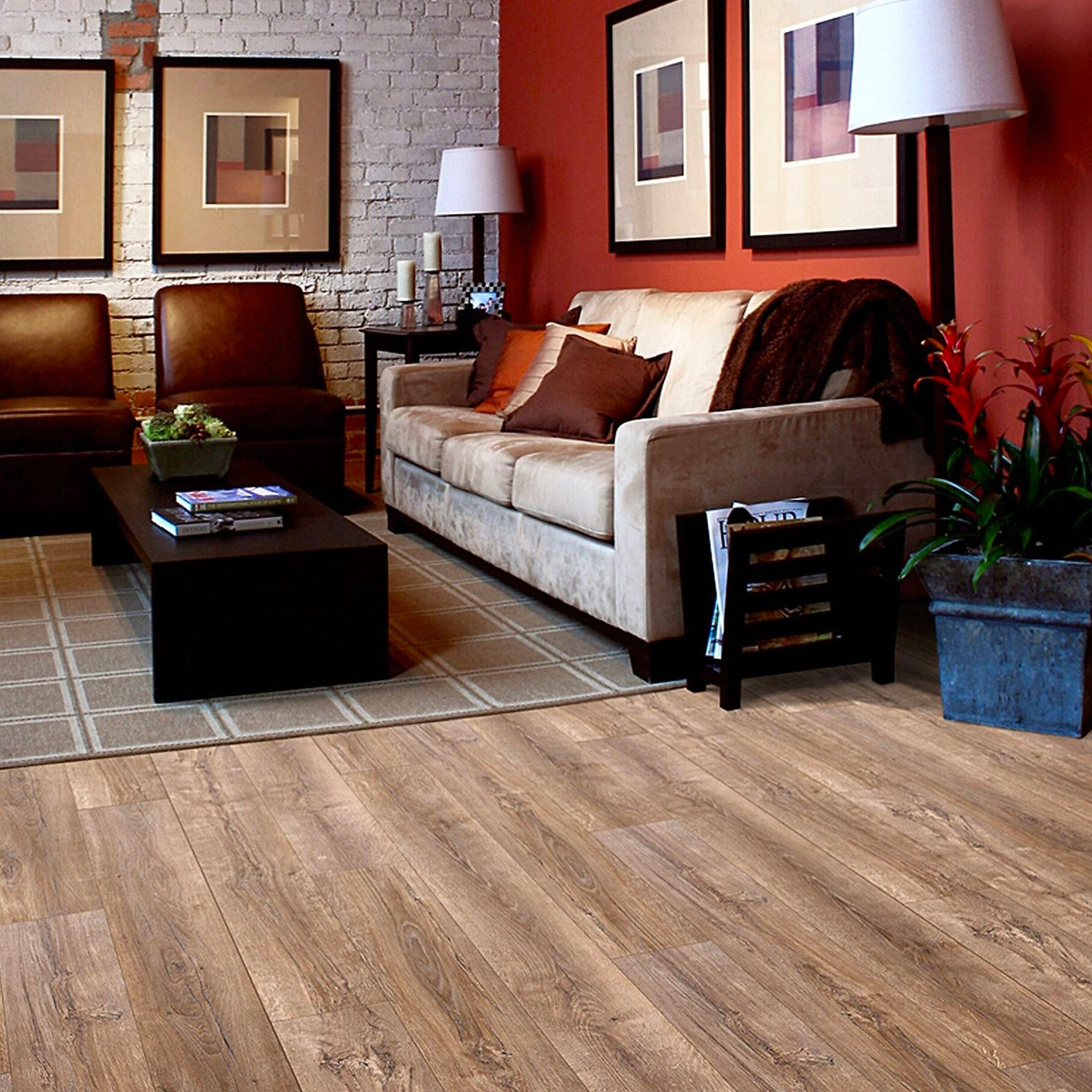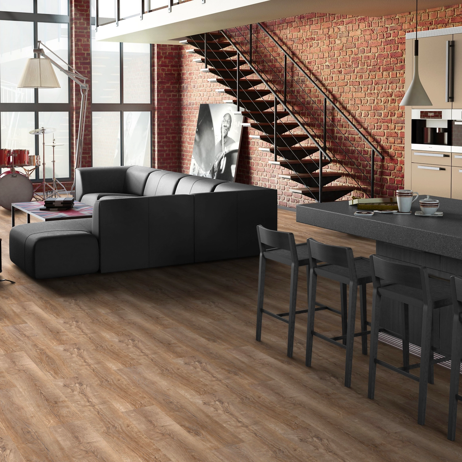 Половицы с фактурой состаренной древесины и четырехсторонней фаской создают впечатление благородного дубового паркета. Ламинат в сдержанной гамме оттенков подходит для воплощения в интерьере как элегантных классических, так и смелых современных стилистических решений.