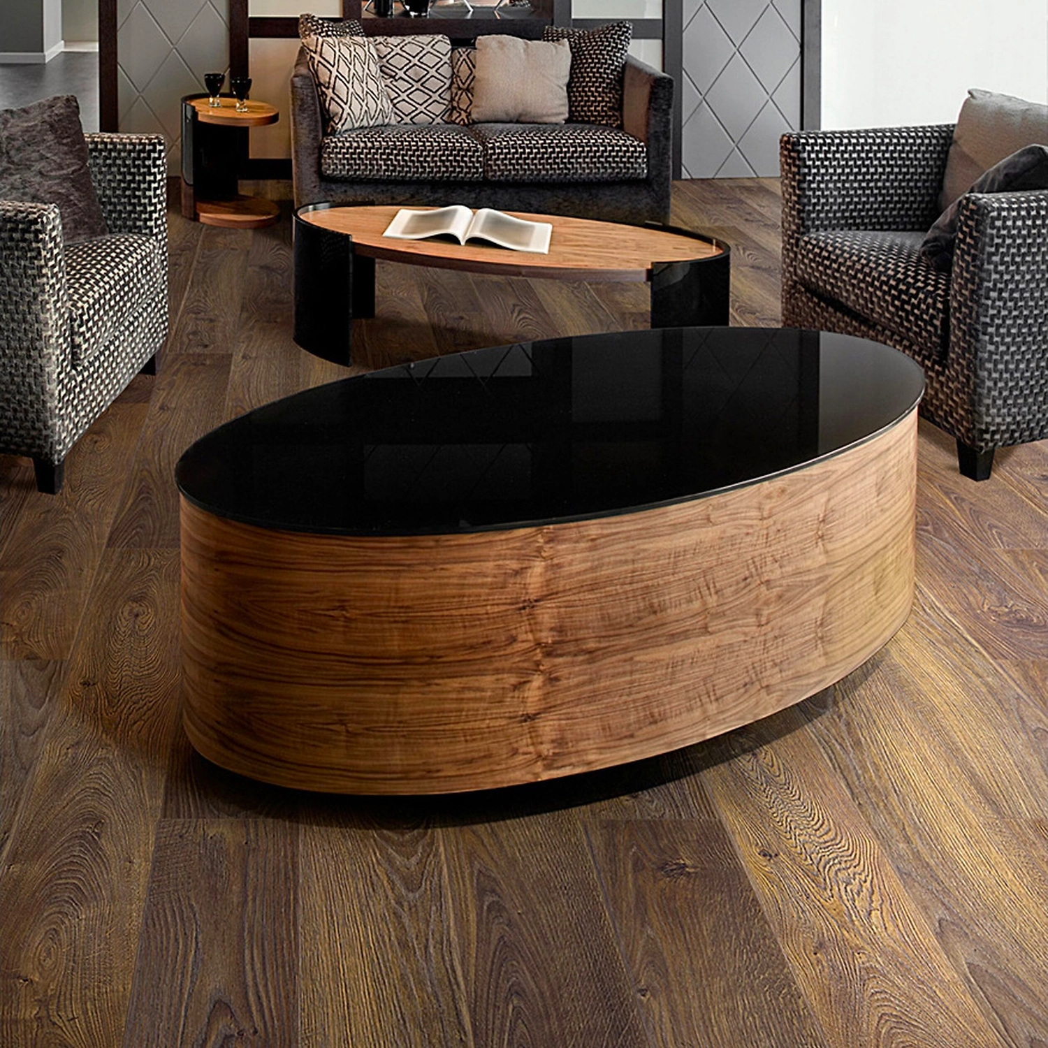 Традиционный золотисто-коричневый оттенок лакированной дубовой доски всегда был в моде. Универсальное покрытие, больше похожее на благородный паркет, хорошо сочетается с мебелью и декором как в классических, так и в современных стилях.