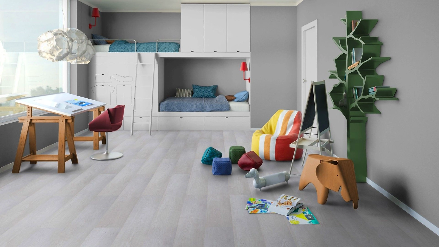 Ламинат имеет ярко выраженную древесную текстуру, которая достигается благодаря тиснению в регистре. Светлый “деревянный” пол органично смотрится в интерьерах с элементами скандинавского стиля, а также минимализм, хай-тек, арт-деко, лофт. Эффект “хромированной поверхности” делает покрытие стильным и оригинальным.