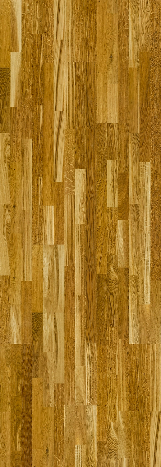 В трехполосном исполнении плашки для верхнего слоя подбираются вручную - это позволяет комбинировать цвета от светлых до темных оттенков. Такая палитра с выраженной структурой дерева хорошо смотрится в жилых помещениях: залах, гостиных, прихожих, коридорах.