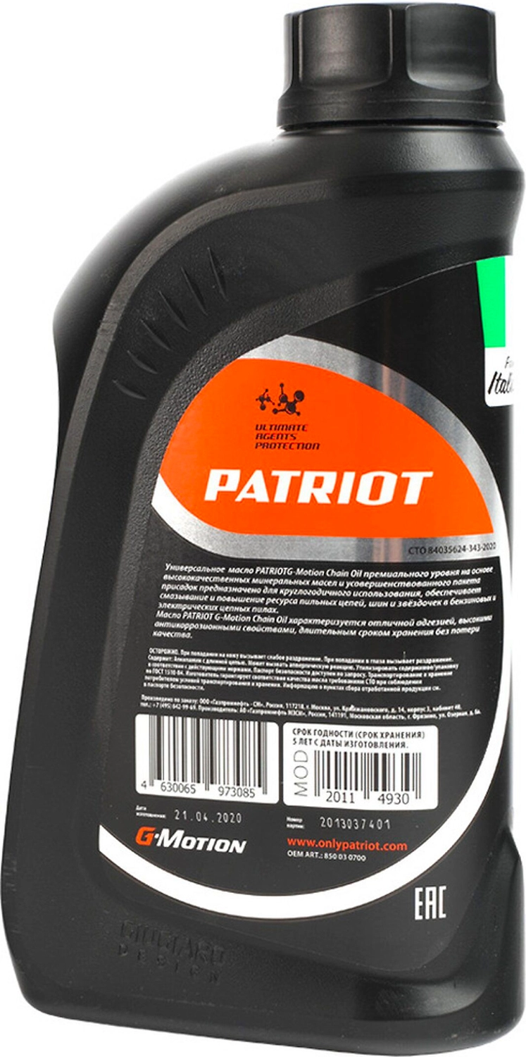 Универсальное масло PATRIOT G-Motion Chain Oil премиального уровня на основе высококачественных минеральных масел и усовершенствованного пакета присадок предназначено для круглогодичного