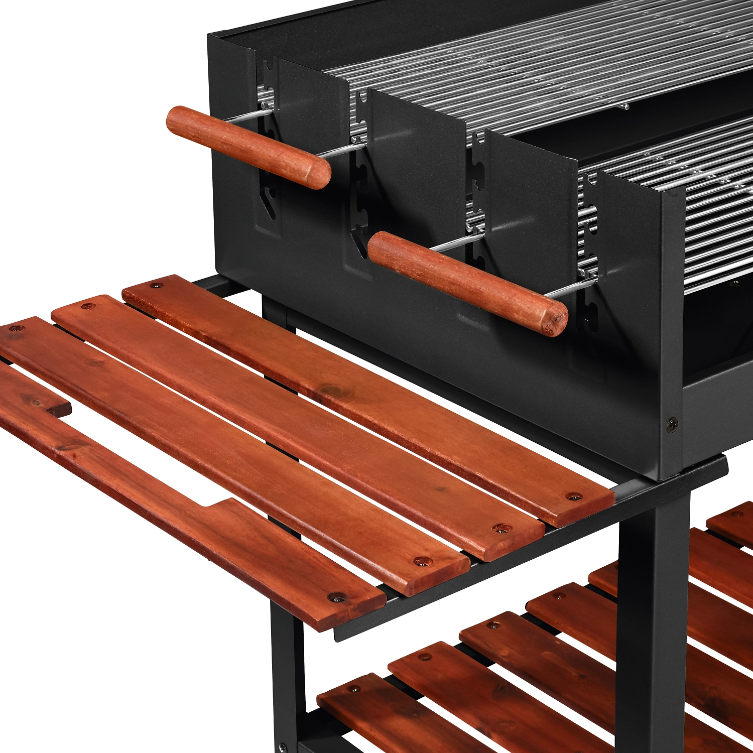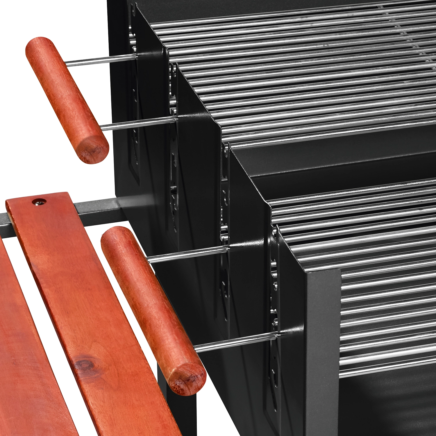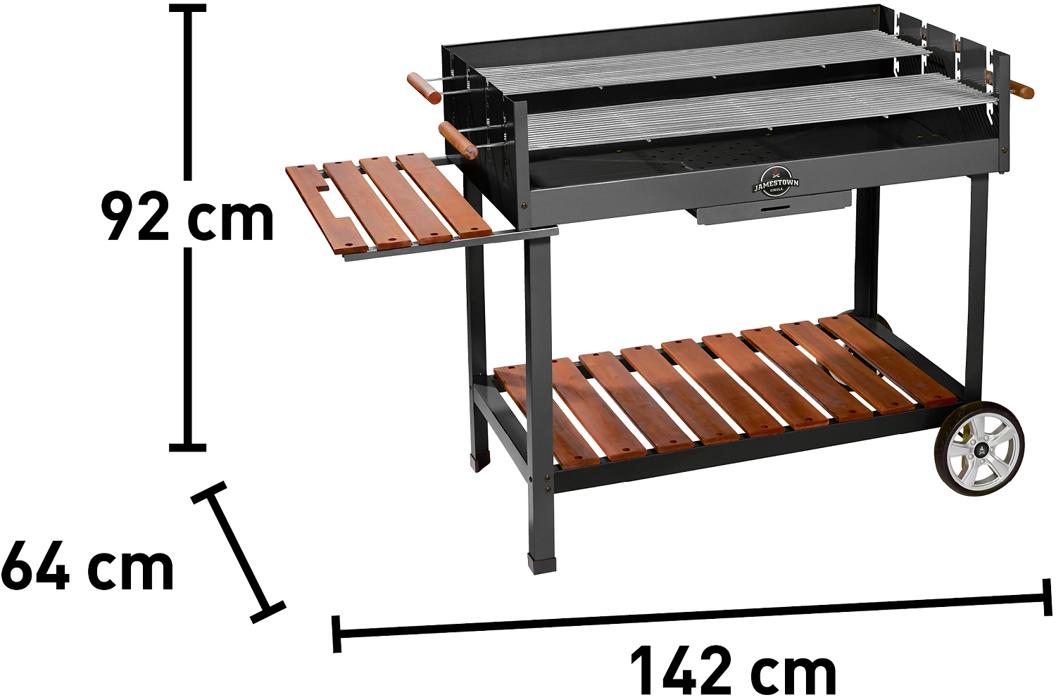 Угольный гриль JAMESTOWN GRILL Ben XL имеет прочный стальной каркас и двойную регулируемую решетку, оснащен полками для хранения и небольшими колесами.