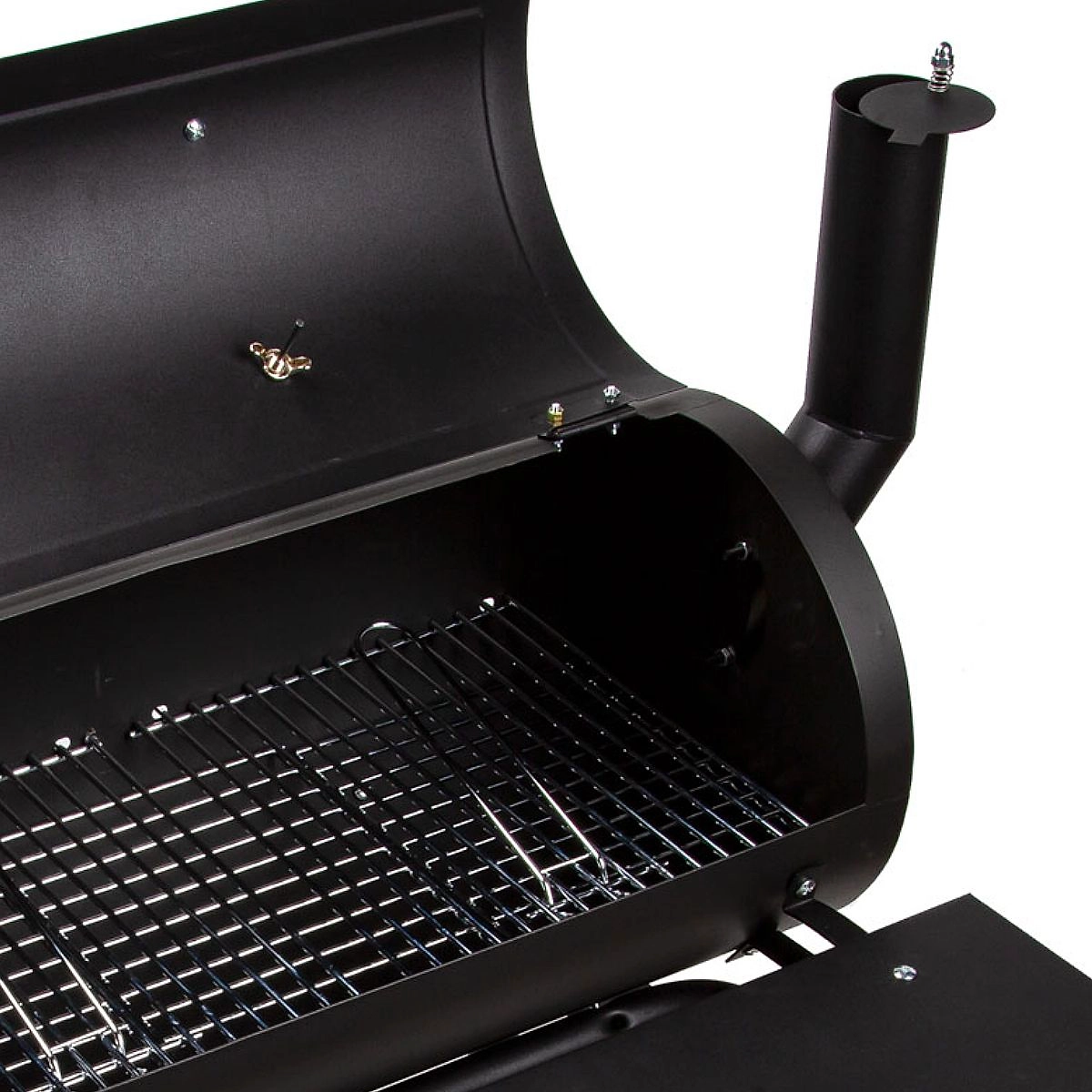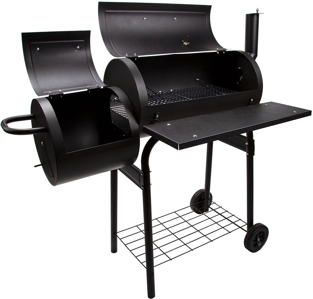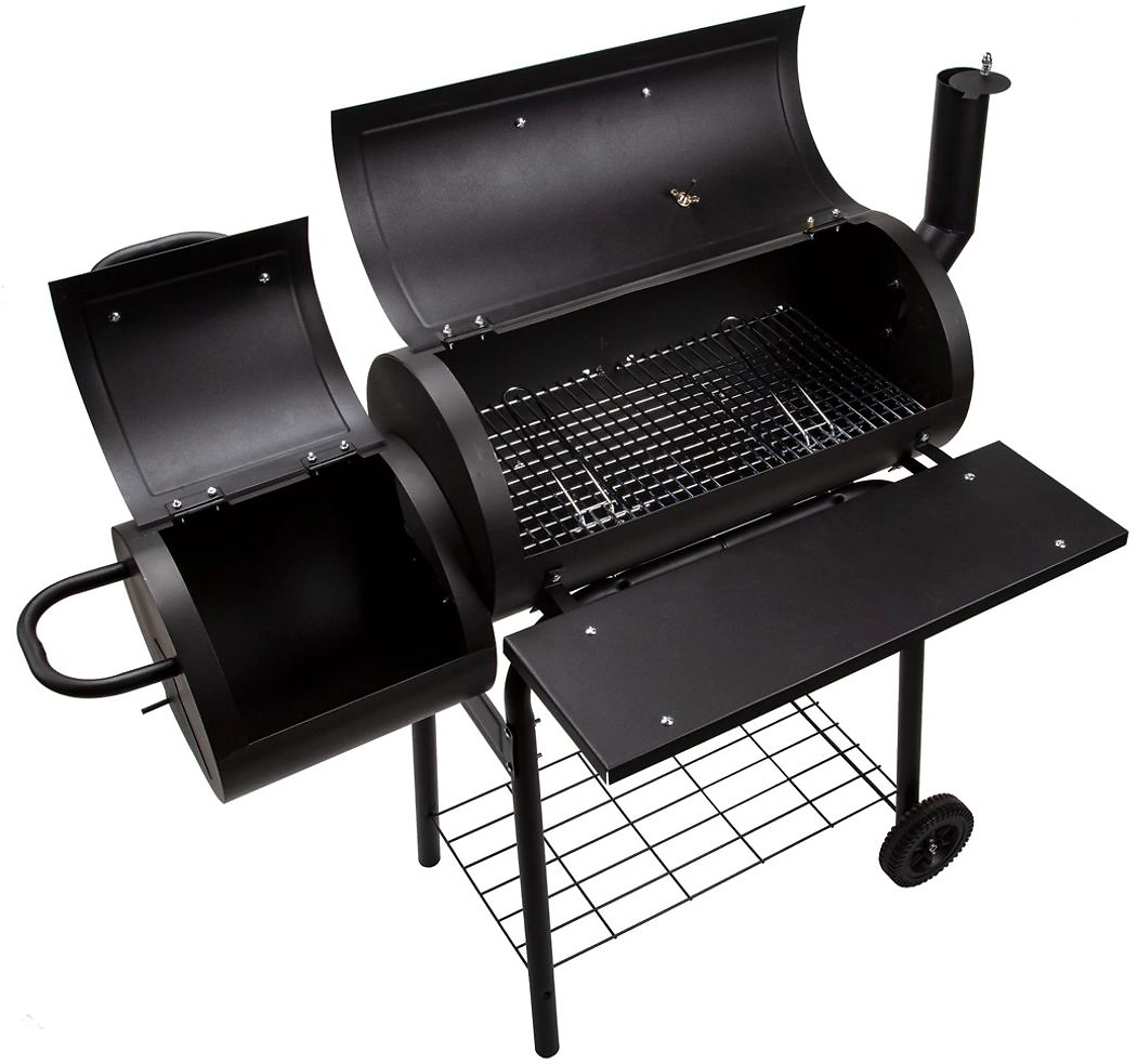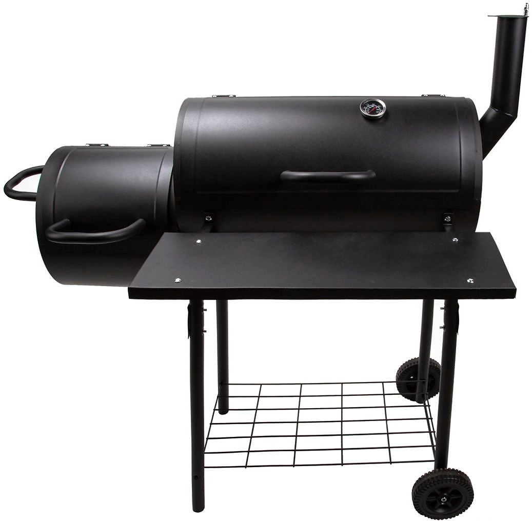 Благодаря четырем ножкам конструкция обладает устойчивостью, а с помощью колес ее можно передвинуть в любое удобное место. У гриля-коптильни есть две полочки, которые можно использовать в качестве рабочей поверхности и подставки для необходимых предметов. А благодаря наличию термостата можно контролировать и регулировать температуру./p>