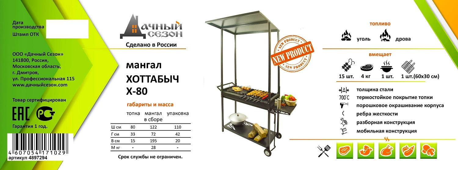 Мангал стационарный Хоттабыч с крышей 122х72х195 см