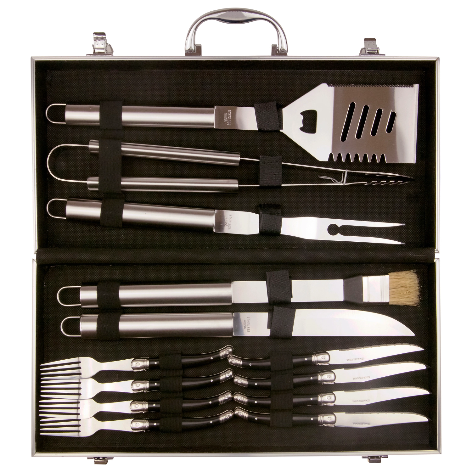 Набор включает в себя 14 предметов: лопатку , щипцы , вилку для мяса , нож для мяса , кисть для смазки, 4 столовых вилки, 4 столовых ножа, алюминиевый чемодан для переноски и хранения