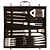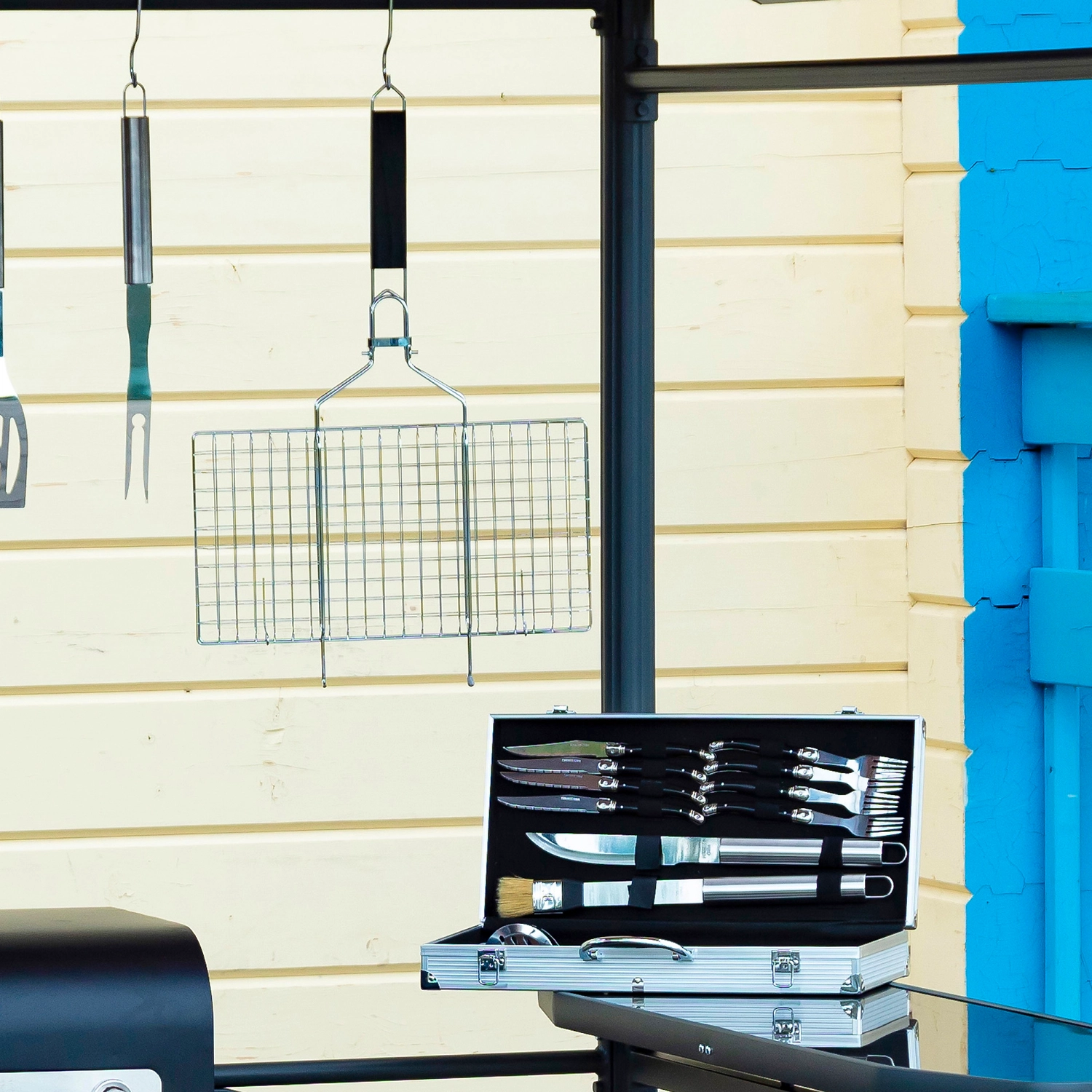 лопатка, щипцы, вилка для мяса, нож для мяса, кисть для смазки, столовая вилка: 4 шт, столовый нож: 4 шт, кейс
