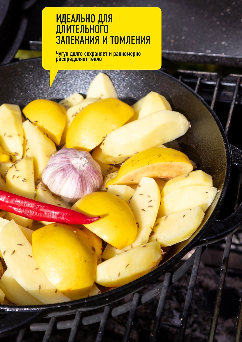 - При высоких температурах и достаточном количестве жира на стенках чугунной посуды образуется естественное антипригарное покрытие, поэтому продукты не прилипают при приготовлении.