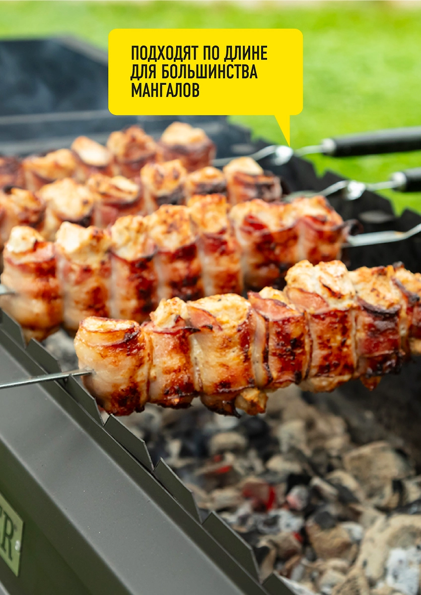 Изделия выполнены из прочного, упругого металла с пищевым антикоррозийным покрытием, которое абсолютно безопасно для здоровья человека. Спиральная конструкция надежно фиксирует куски мяса, не прогибается и хорошо удерживает вес даже крупных порций. Шампуры оснащены эргономичной деревянной ручкой, которая не скользит в руке и удобна при переворачивании мяса.