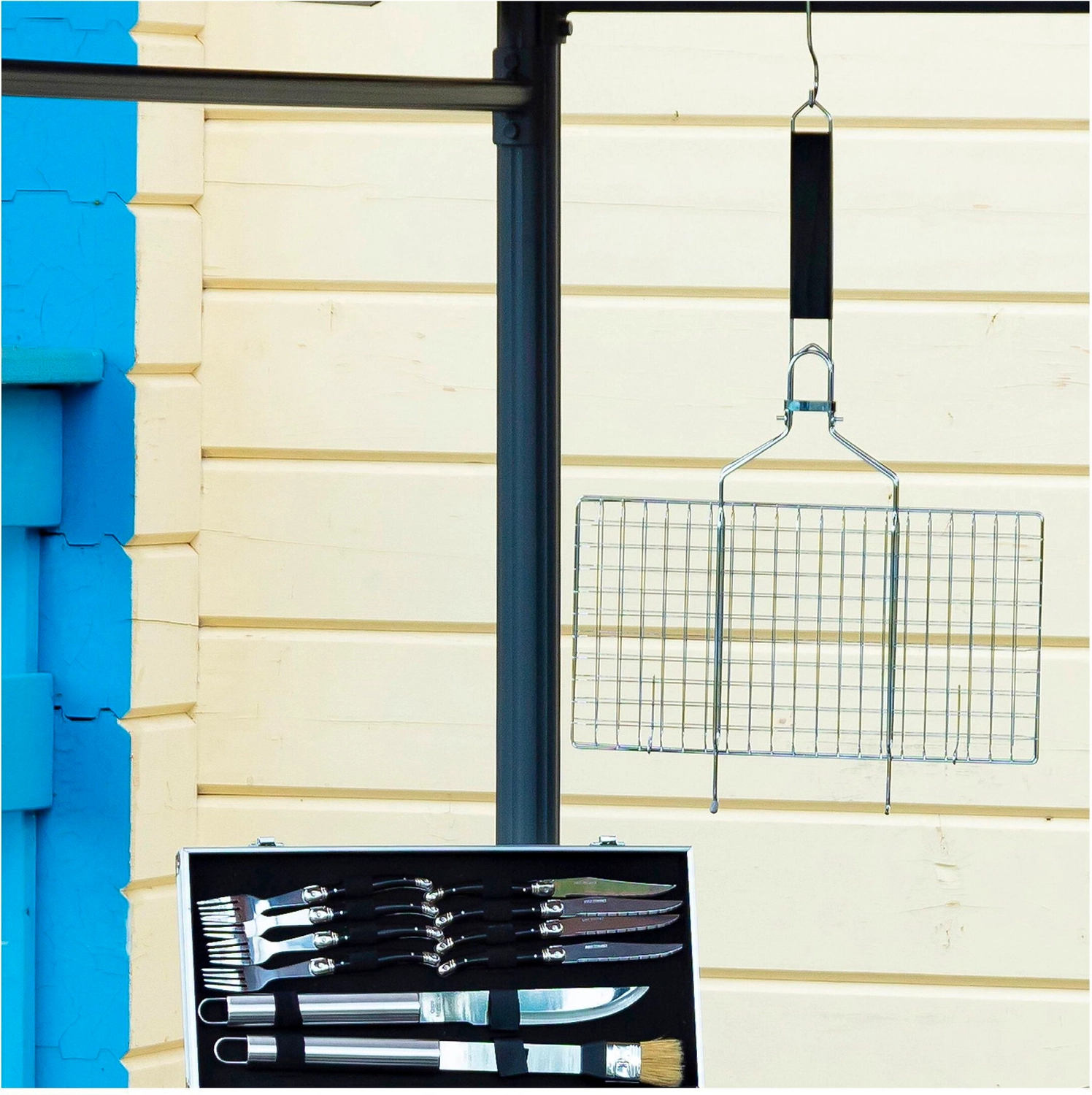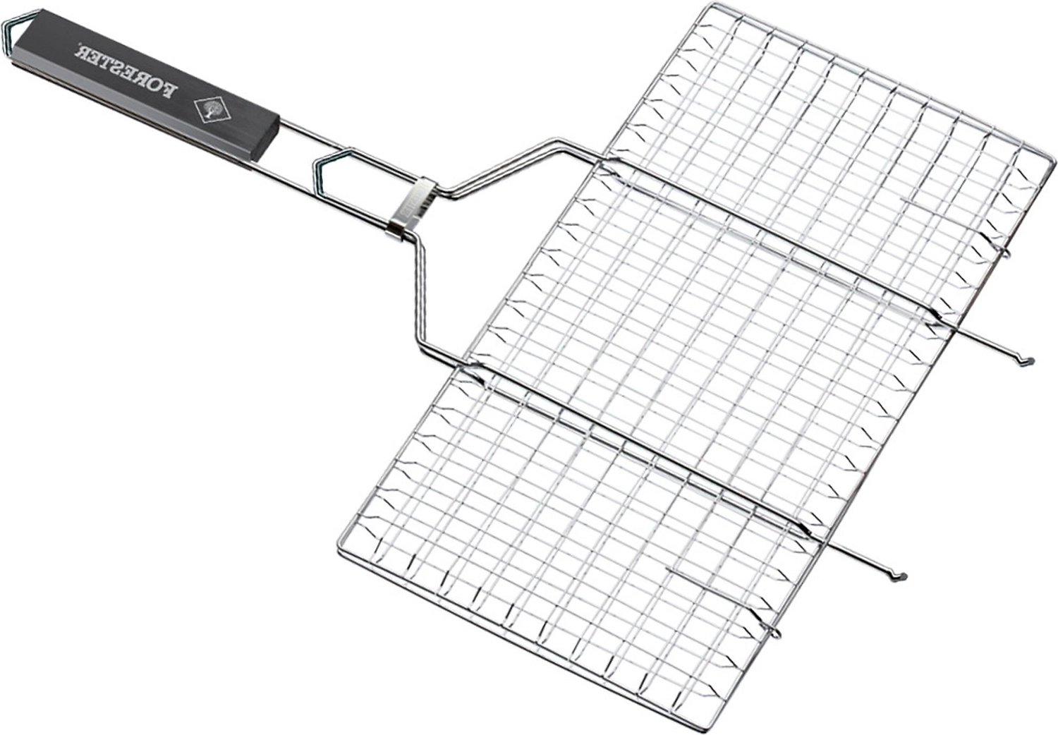 Удобная ручка, с помощью которой решетку удобно переворачивать, практически не нагревается во время приготовления продуктов и поэтому не обжигает рук. Усики-фиксаторы гарантируют устойчивое положение. А благодаря надежному фиксирующему кольцу продукты в процессе готовки на решетке для стейков Forester не выпадают из нее. Большая решетка для барбекю отличное решение для загородного отдыха, пикника и рыбалки.