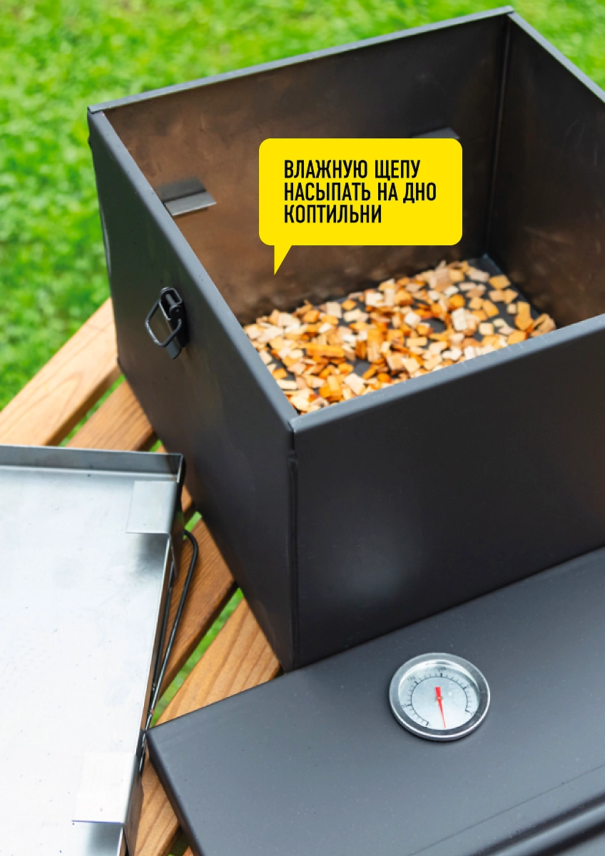 - Поставьте лоток на тлеющие угли или на специальный лоток для щепы