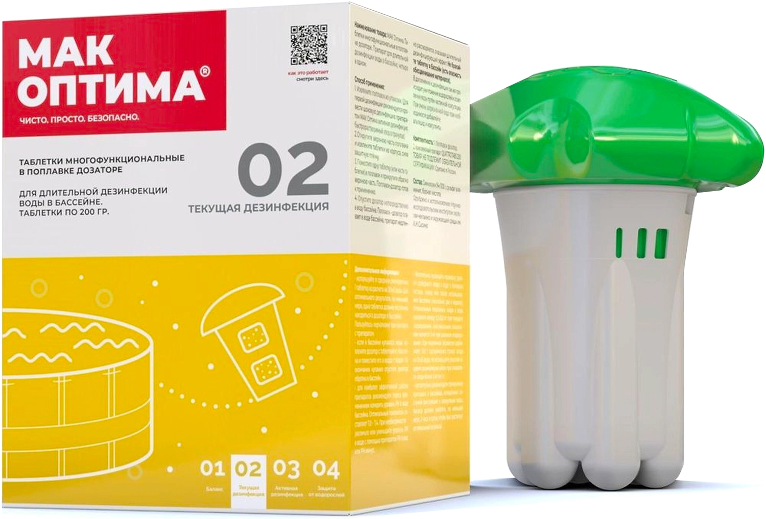 Препарат находится в небольшом, удобном для использования поплавке-дозаторе, имеющем оригинальный дизайн. Для активации его достаточно опустить в воду. В бассейне объемом до 30 кубометров действие препарата из дозатора продлится 6-8 недель. На это время можно забыть о неприятном зеленом налете на стенках и не беспокоиться о цвете и качестве воды.