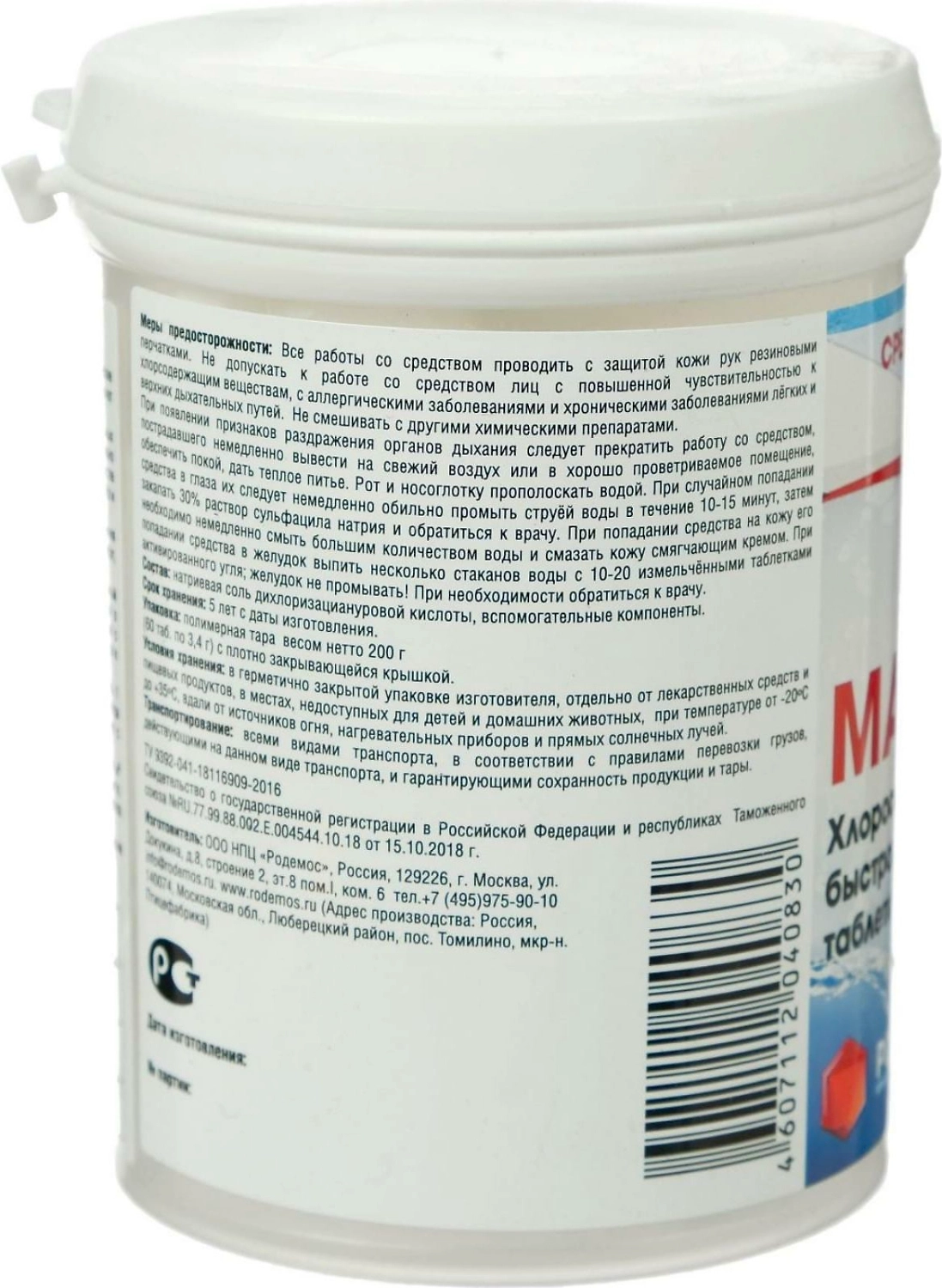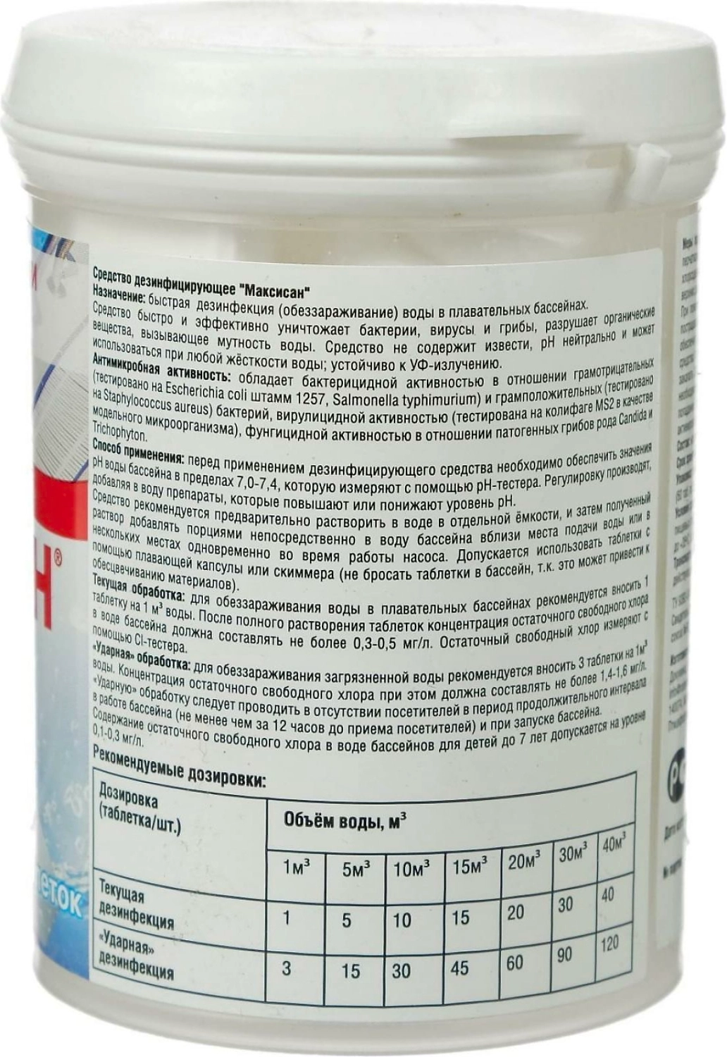 Дезинфицирующее средство, представляет собой хлорсодержащие быстрорастворимые таблетки. Предназначено для обеззараживания воды в системах хозяйственно-питьевого водоснабжения при централизованном водоснабжении, обеззараживания групповых запасов воды при нецентрализованном водоснабжении, а также емкостей для хранения воды, дезинфекции шахтных колодцев и обеззараживанию воды в них, обеззараживания воды плавательных бассейнов, дезинфекции различных объектов в помещениях бассейна (поверхности ванны бассейна, раздевальнях, душевых, резиновых ковриков, уборочного инвентаря и т.д.). Средство предназначено для применения специалистами предприятий, организаций, учреждений, деятельность которых связана с эксплуатацией плавательных бассейнов, а также работников дезинфекционных станций, других учреждений, имеющих право заниматься дезинфекционной деятельностью, населением в быту в соответствии с этикеткой для быта.