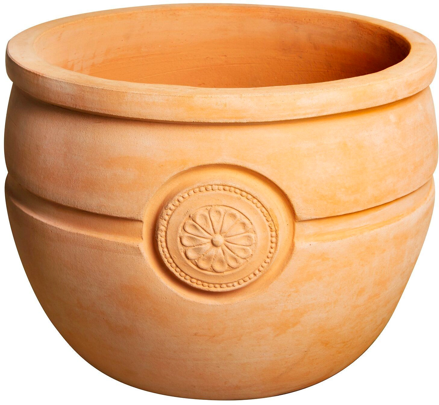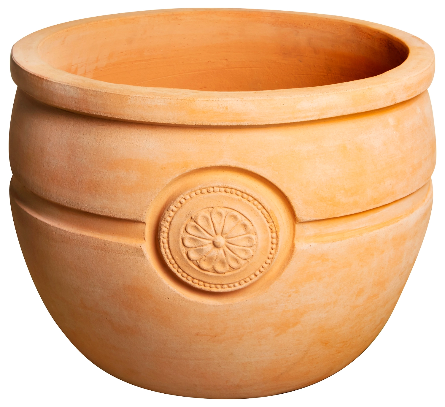 Круглый декоративный горшок из керамики – отличный вариант для высадки комнатных растений. За счет этнического дизайна изделие станет изюминкой интерьера.