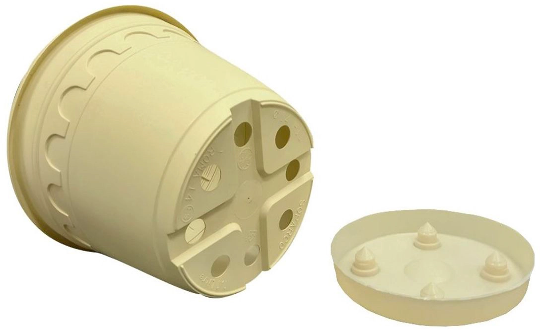 Сочетание классического итальянского дизайна и матового покрытия визуально придает эффект ощущение керамического горшка. Форма дна и достаточное количество дренажных отверстий позволяют плотно защелкивать поддоны (в комплекте), при этом оставляя дополнительные отверстия для стока лишней воды при переливах.