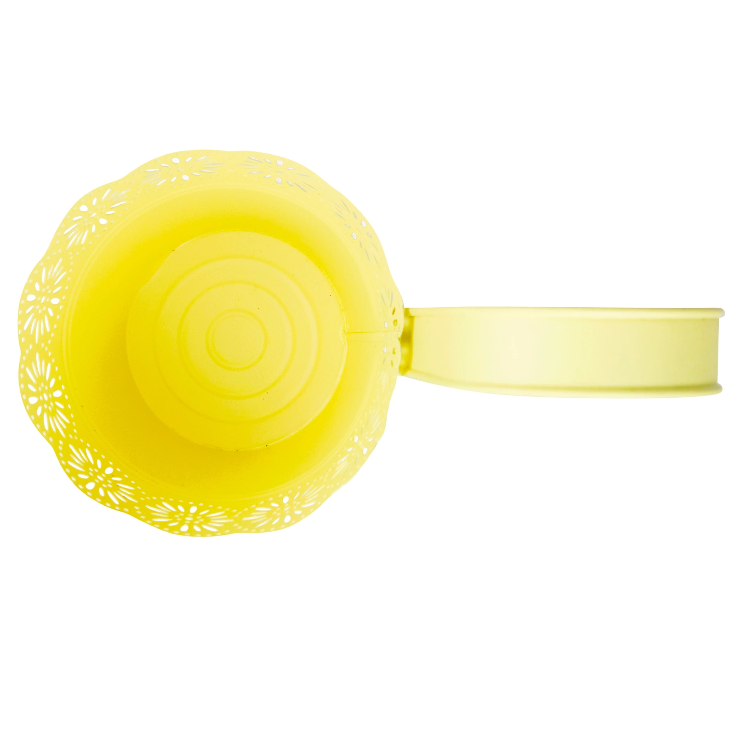 Красивое и практичное кашпо из металла станет украшением веранды, балкона или приусадебного участка. Изделие выполнено в желтом цвете. Благодаря ажурной вставке аксессуар смотрится особенно привлекательно. Кашпо дополнено специальным крючком для подвешивания.
