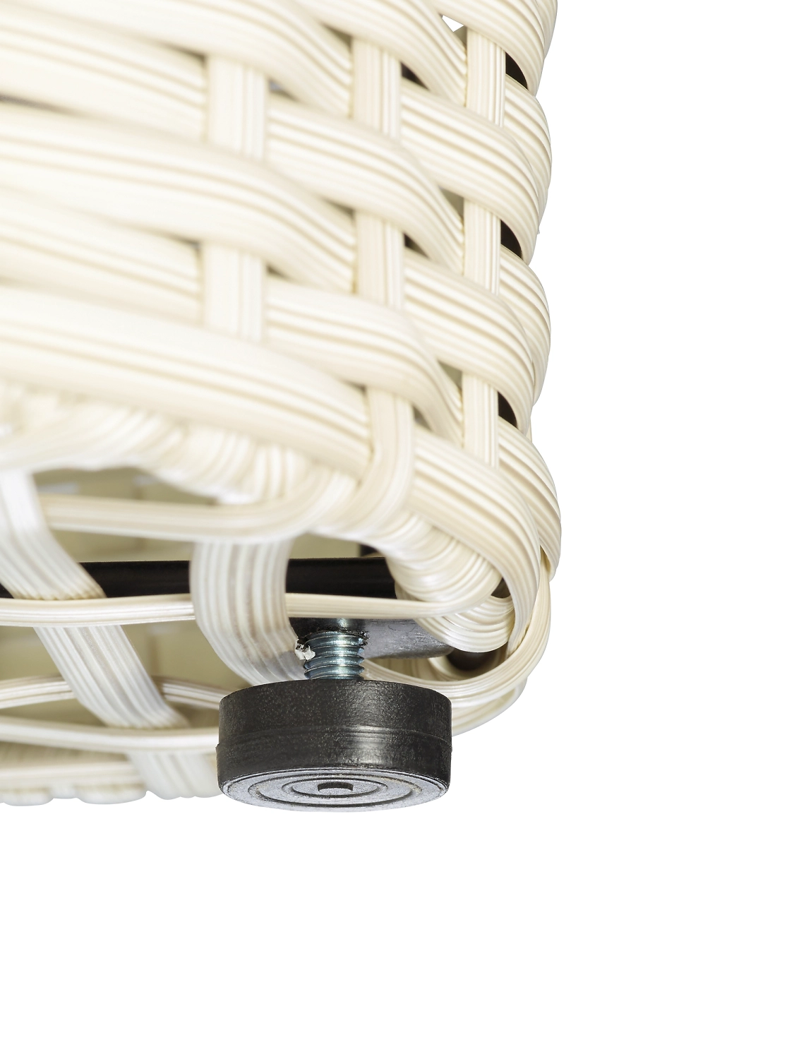 Основа кашпо - пластиковая. Она украшена декоративным плетением из ротанга белого цвета. Для удобства использования изделие оснащено округлыми ножками, вкручивающимися в основную конструкцию, которые можно регулировать по высоте. Ножки имеют нескользящее покрытие.