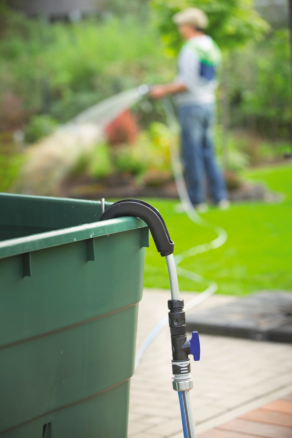 Насос погружной CMI для дождевых бочек мощностью 400 Вт позволяет поливать садовый участок прямо из емкости с водой. К устройству подсоединяются садовые шланги и разбрызгиватели.