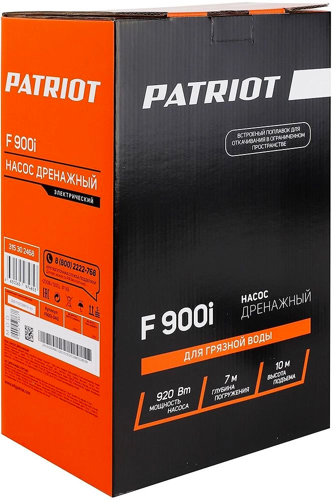 PATRIOT F 900I - мощный погружной насос для откачивания воды из различных емкостей и водоемов и подачи ее для полива растений или в бытовых целях. Устройство подходит для чистой и грязной воды с твердыми частицами до 35 мм.