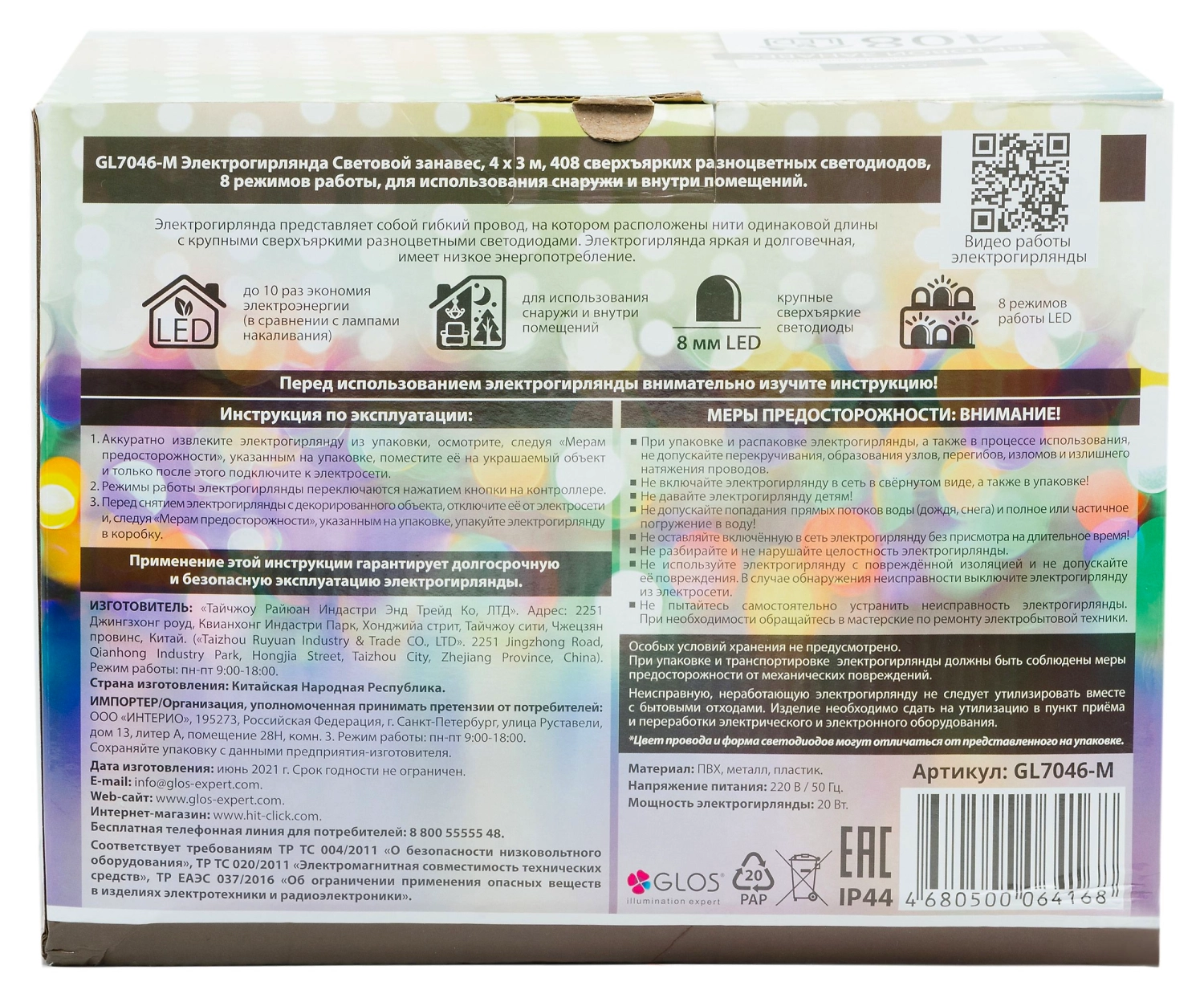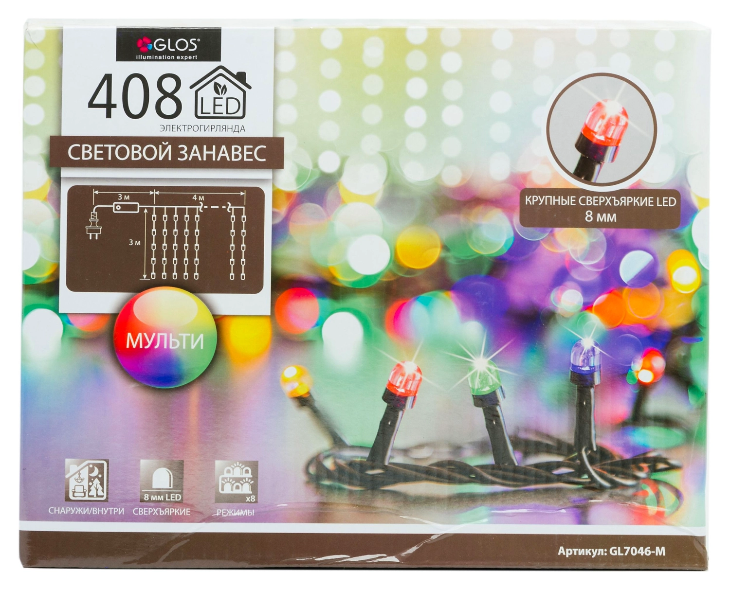 Электрогирлянда GLOS Световой занавес 4х3 м 408 разноцветных светодиодов