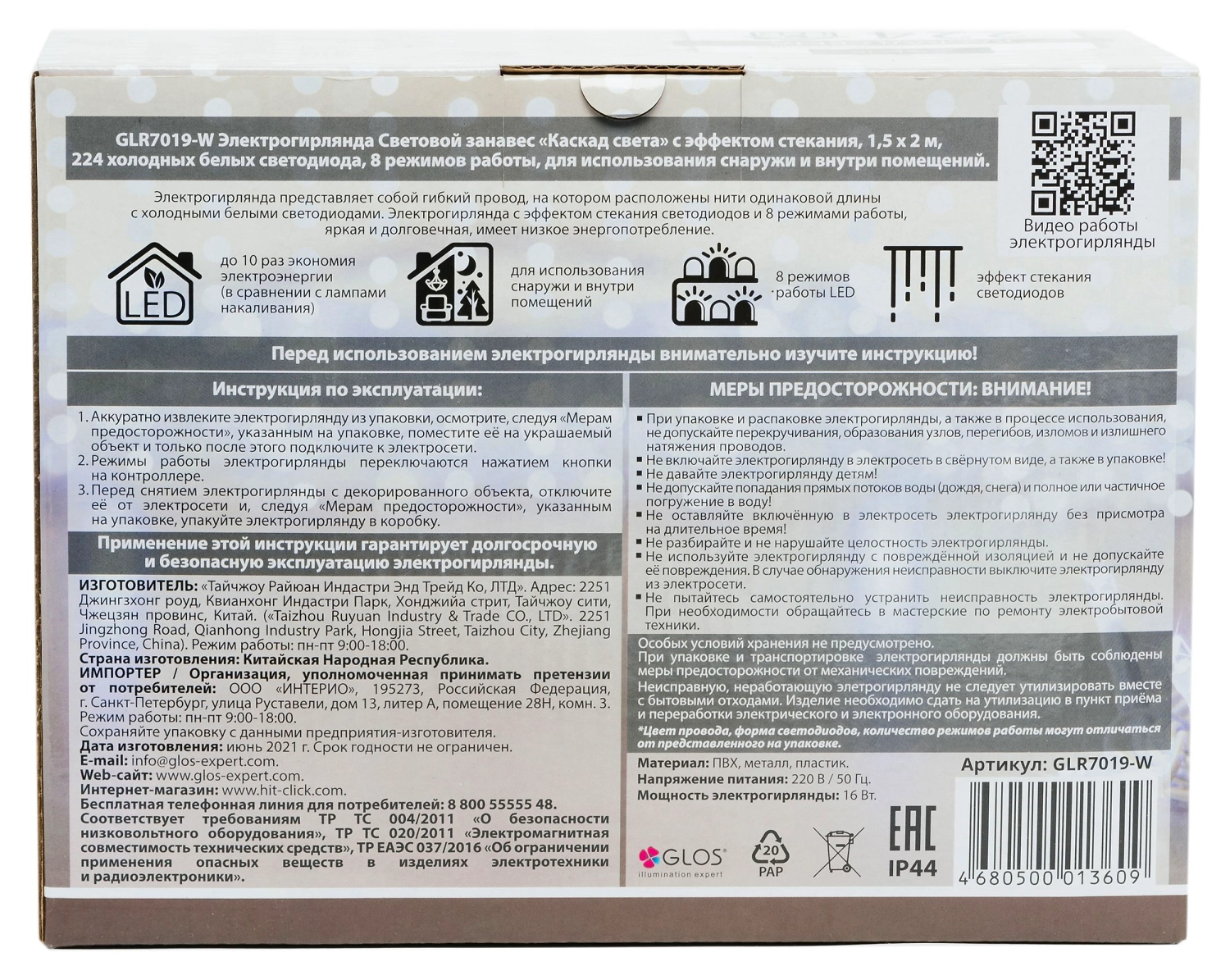 Электрогирлянда световой занавес "Каскад света" с эффектом стекания, 1,5 м х 2 м, 224 холодных белых светодиода, для использования снаружи и внутри помещений.