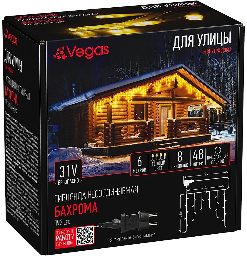 Электрогирлянда VEGAS 31V Бахрома 192 теплых LED ламп 48 нитей 6x0,6 м 8 режимов