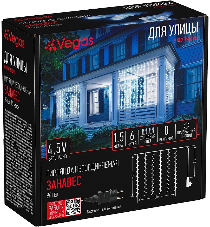Электрогирлянда VEGAS Занавес 96 холодных LED ламп 1,5x1,5 м 8 режимов