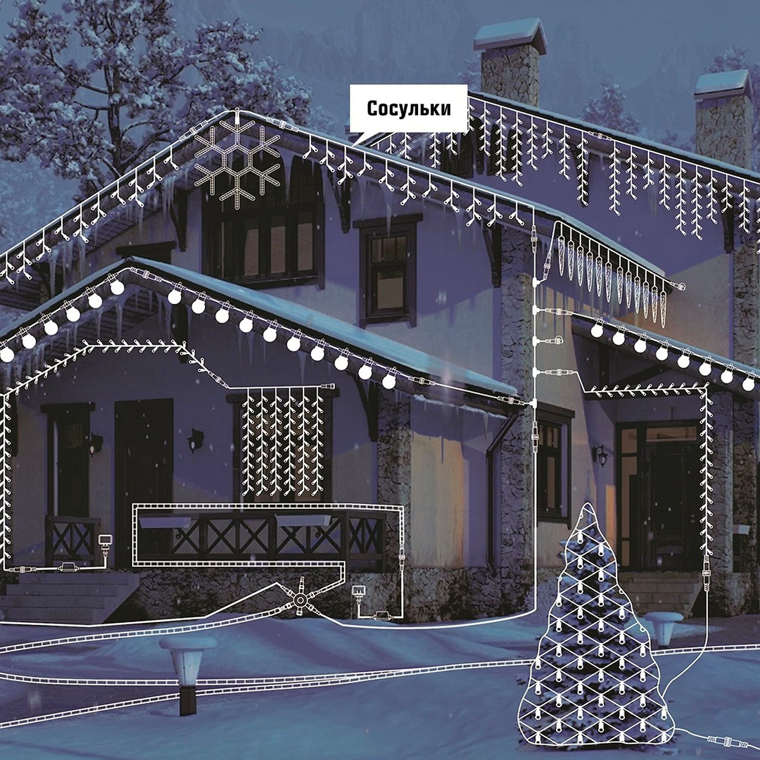 В первые дни зимы Дедушка Мороз начинает обходить свои владения, покрывать инеем ветки, навешивать на густую зеленую хвою елей и крыши домов рыхлый снежок, наносить на стекла причудливые узоры. Вся эта красота останется незамеченной в темноте долгой зимней ночи, если не подсветить ее новогодней уличной гирляндой Сосульки.