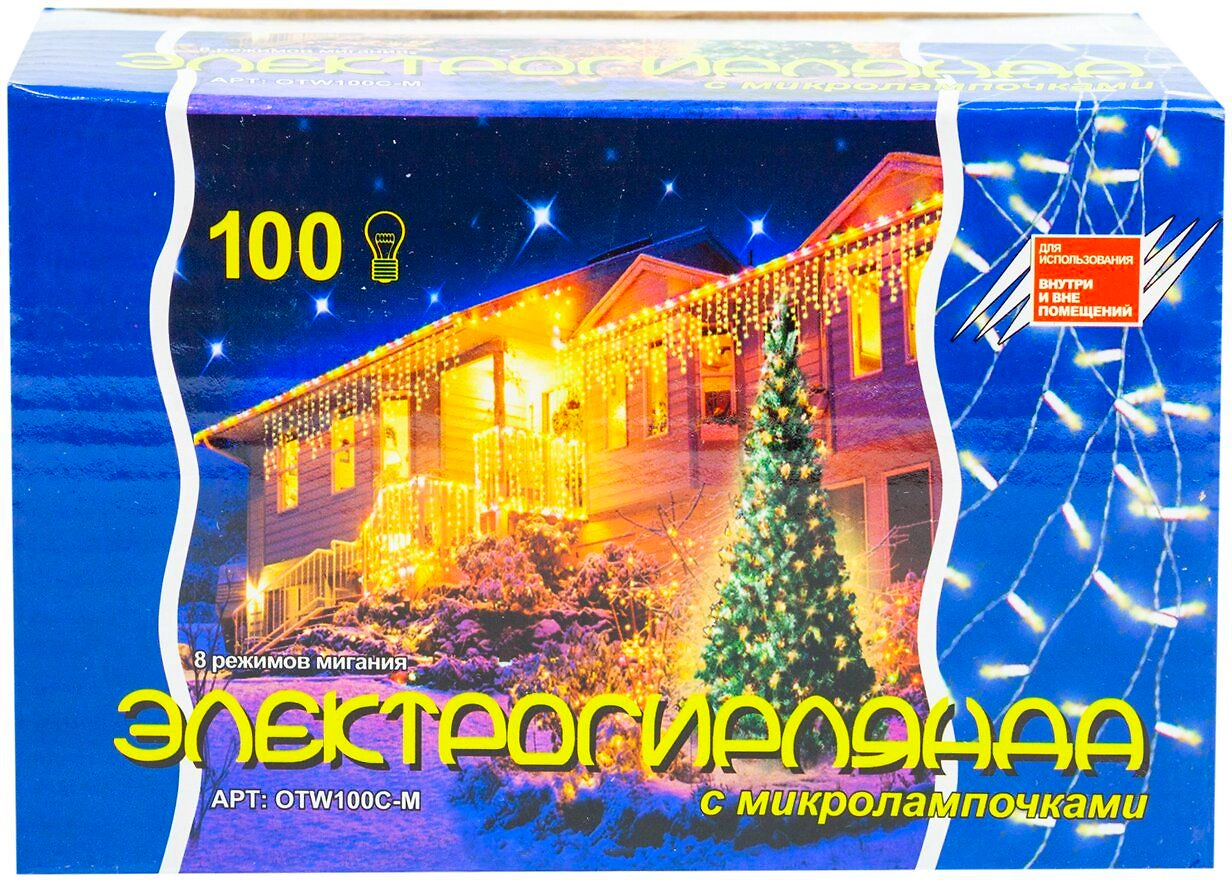 - Гирлянда имеет вид тонкого провода, на котором, через определенное расстояние, расположены 100 цветных микролампочек. Для создания праздничной светодинамики в общий провод гирлянды вмонтирован специальный контроллер, позволяющий управлять 8 режимами свечения
