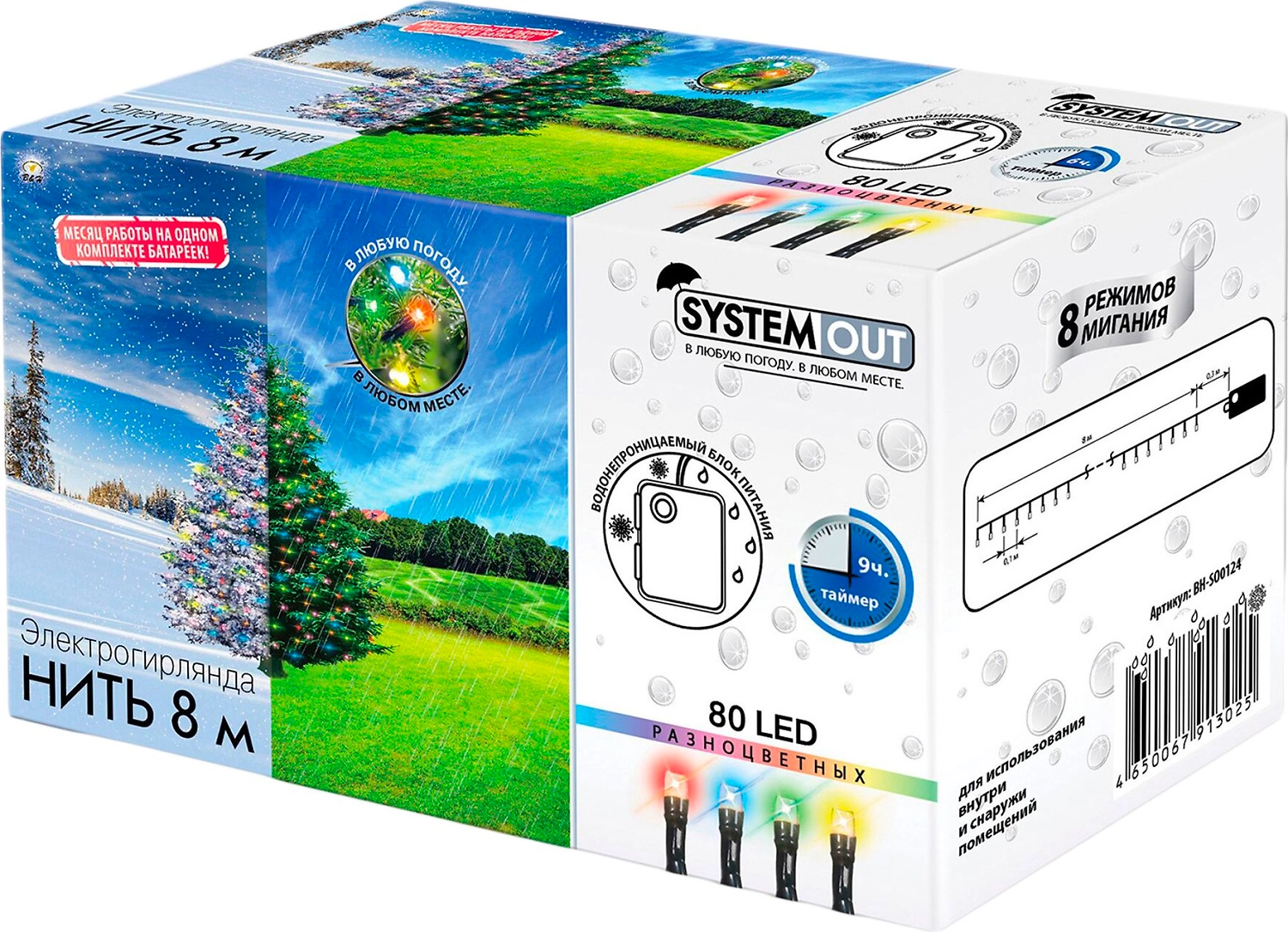 Гирлянда внешняя из продуктовой линейки System Out рассчитана на эксплуатацию в экстремальных погодных условиях. Эффектная иллюминация создается благодаря 80 разноцветным LED-лампочкам с 8 режимами мигания.