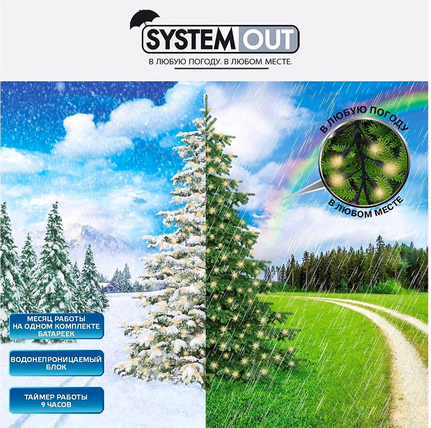 System Out - серия уличных гирлянд с водонепроницаемым блоком питания. Такая декоративная подсветка подходит для эксплуатации в сильные морозы, бесперебойно работает даже под слоем снега.