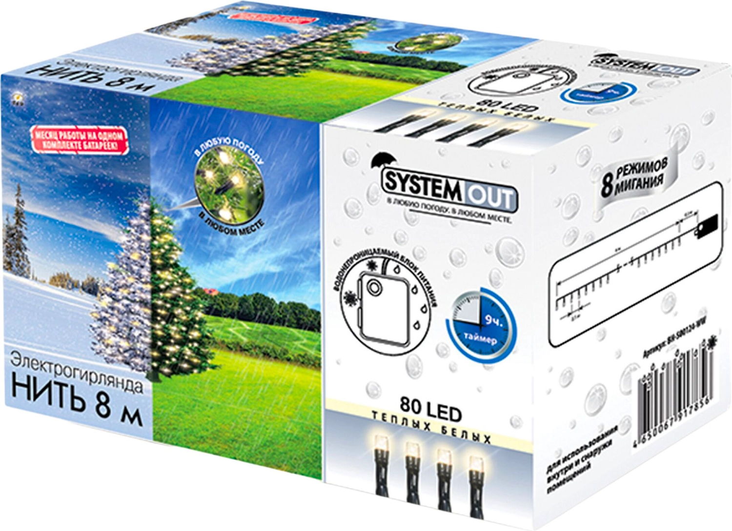 Гирлянда внешняя из продуктовой линейки System Out рассчитана на эксплуатацию в экстремальных погодных условиях. Эффектная иллюминация создается благодаря 80 разноцветным LED-лампочкам с 8 режимами мигания.