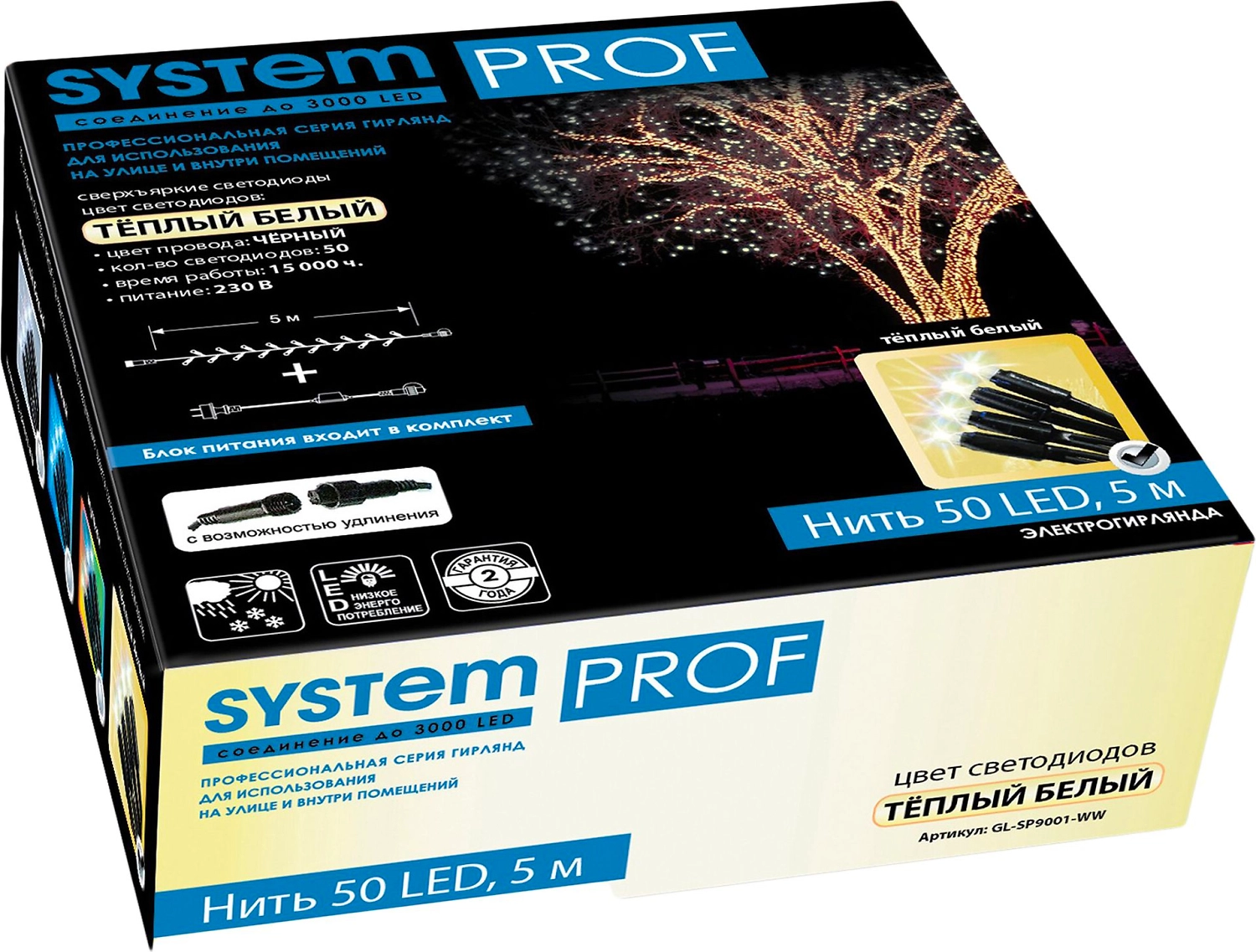 Гирлянда светодиодная относится к специальной линейке System Prof. Подсветка имеет вид черного провода с белыми теплыми LED-лампочками.