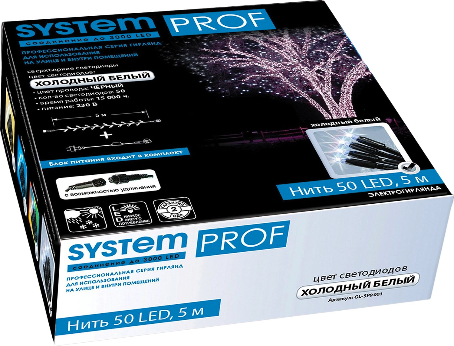 Гирлянда светодиодная относится к специальной линейке System Prof. Подсветка имеет вид черного провода с яркими LED-лампочками, излучающими холодный белый свет.