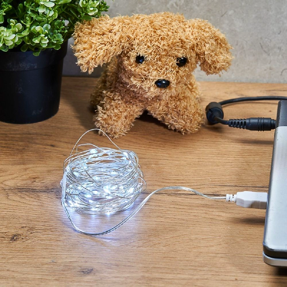 Светодиодная гирлянда "Роса" - прекрасный декоративный элемент, светящийся разными огоньками и создающий атмосферу праздника и уюта. Это отличный способ акцентировать внимание на отдельных предметах интерьера, создать неповторимый арт-объект или использовать в качестве дополнительной подсветки. Гирлянда может эффектно подчеркнуть красоту картины, вазы с цветами, статуэтки или украсить небольшую елочку. Часто "Роса" украшает не только интерьер, но и с успехом применяется на торговых площадках и ярмарках для привлечения внимания к продукции. Гирлянда состоит из тонкого провода длиной 5 метров, с расположенными на нем 50 белыми долговечными светодиодами. В качестве питания у данной модели гирлянды выступает USB-разъем, который крепится на дополнительный провод длиной 20 см. Создайте атмосферу праздника с помощью светодиодной гирлянды "Роса"!