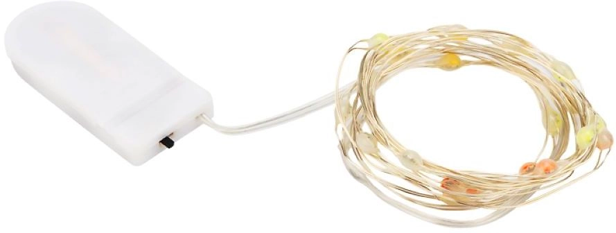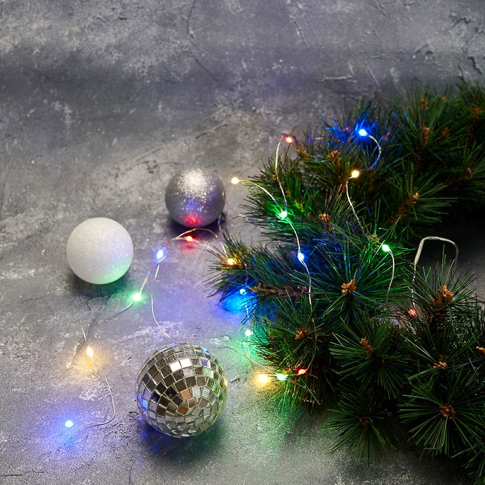 Гирлянда состоит из тонкого провода длиной 2 метра, с расположенными на нем 20 разноцветными долговечными светодиодами.