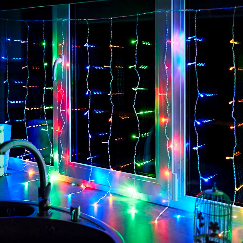 Гирлянда «Дождь» 1,5×1 м в виде занавеса прекрасно подходит для оформления окон в жилых и офисных помещениях. 96 ярких светодиодов, равномерно расположенных по всей длине провода, светятся разноцветными огнями, создавая атмосферу праздника и веселья. Трехметровый шнур питания позволяет подключить изделие к розетке без дополнительных удлинителей. Контроллер на 8 режимов дает возможность управлять подсветкой, меняя динамику свечения.