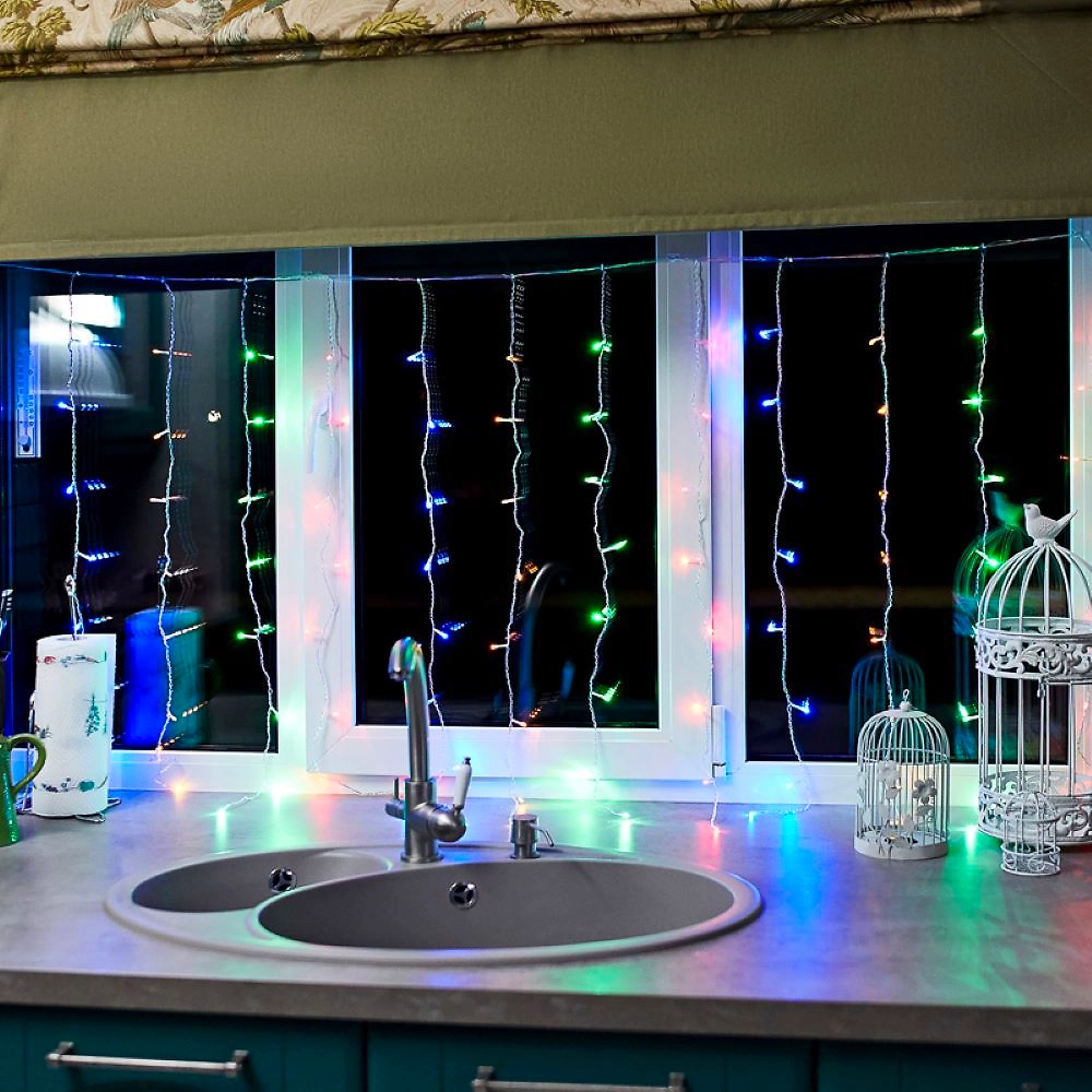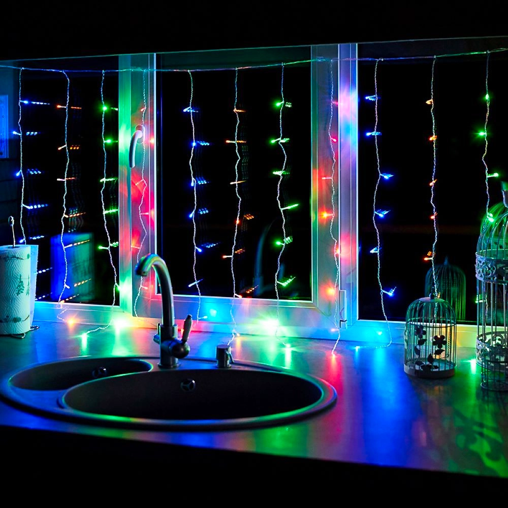 Гирлянда «Дождь» 1,5×1 м в виде занавеса прекрасно подходит для оформления окон в жилых и офисных помещениях.