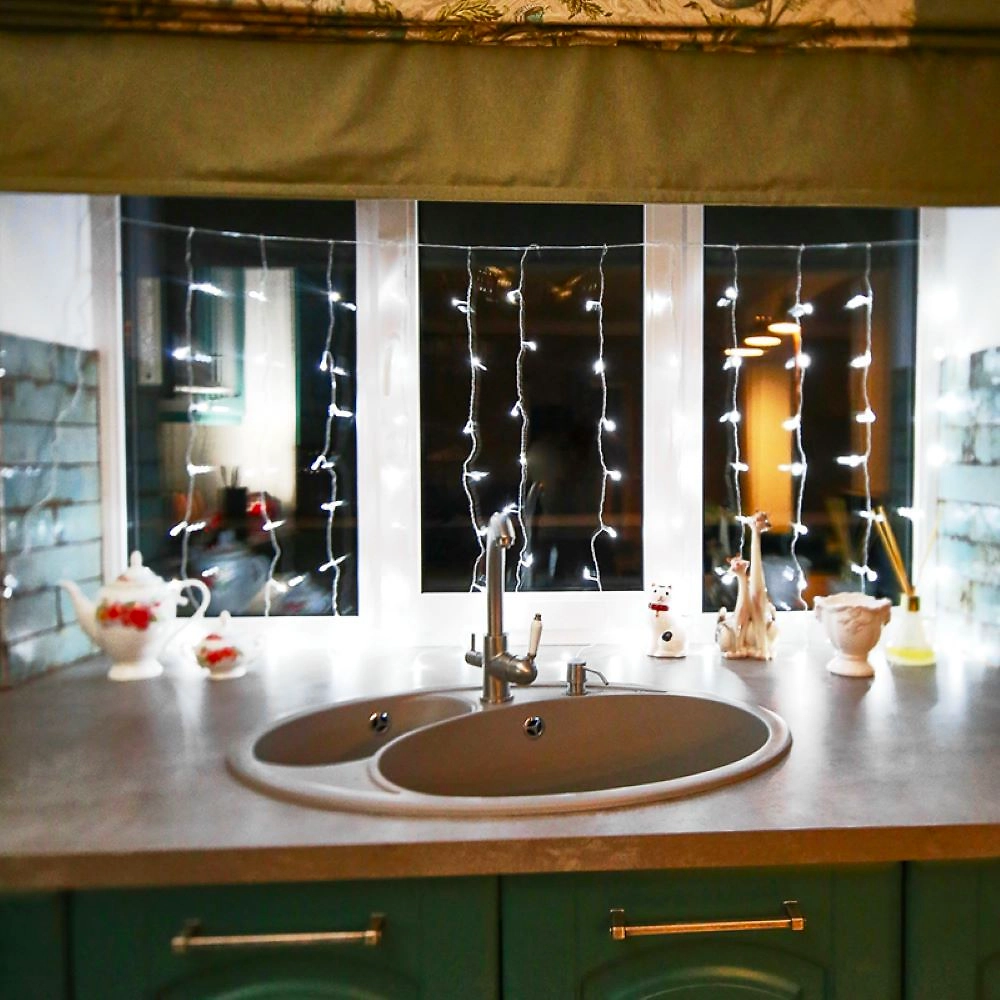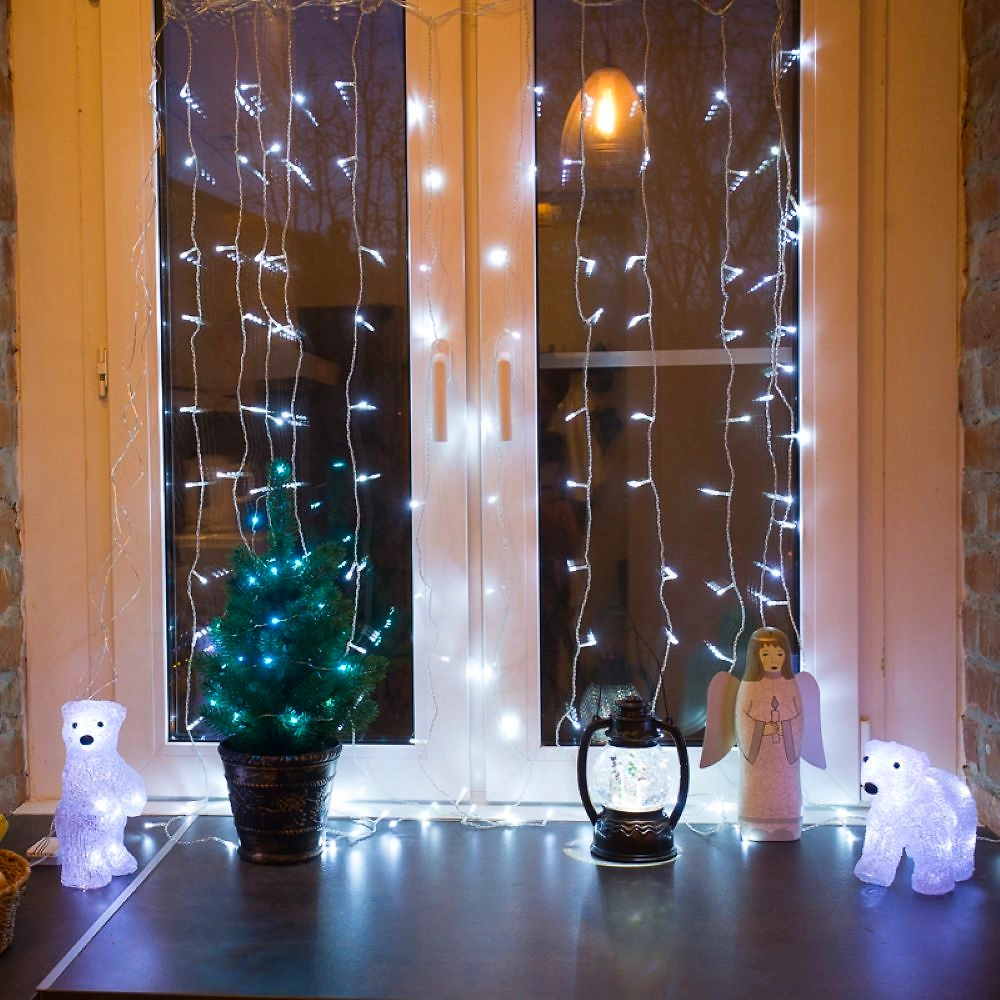 Гирлянда «Дождь» 1,5×1 м, выполнена в виде занавеса и прекрасно подходит для оформления окон в жилых и офисных помещениях. 96 светодиодов, излучающих белый свет, расположены по всей длине гибкого провода. Светодиоды практически не нагреваются во время работы, экономно расходуют энергию и ярко светят на протяжении всего срока службы. Отличительное преимущество интерьерных гирлянд: длина шнура питания 3 метра — этого достаточно, чтобы подключить изделие к розетке в любом удобном месте без использования удлинителей.