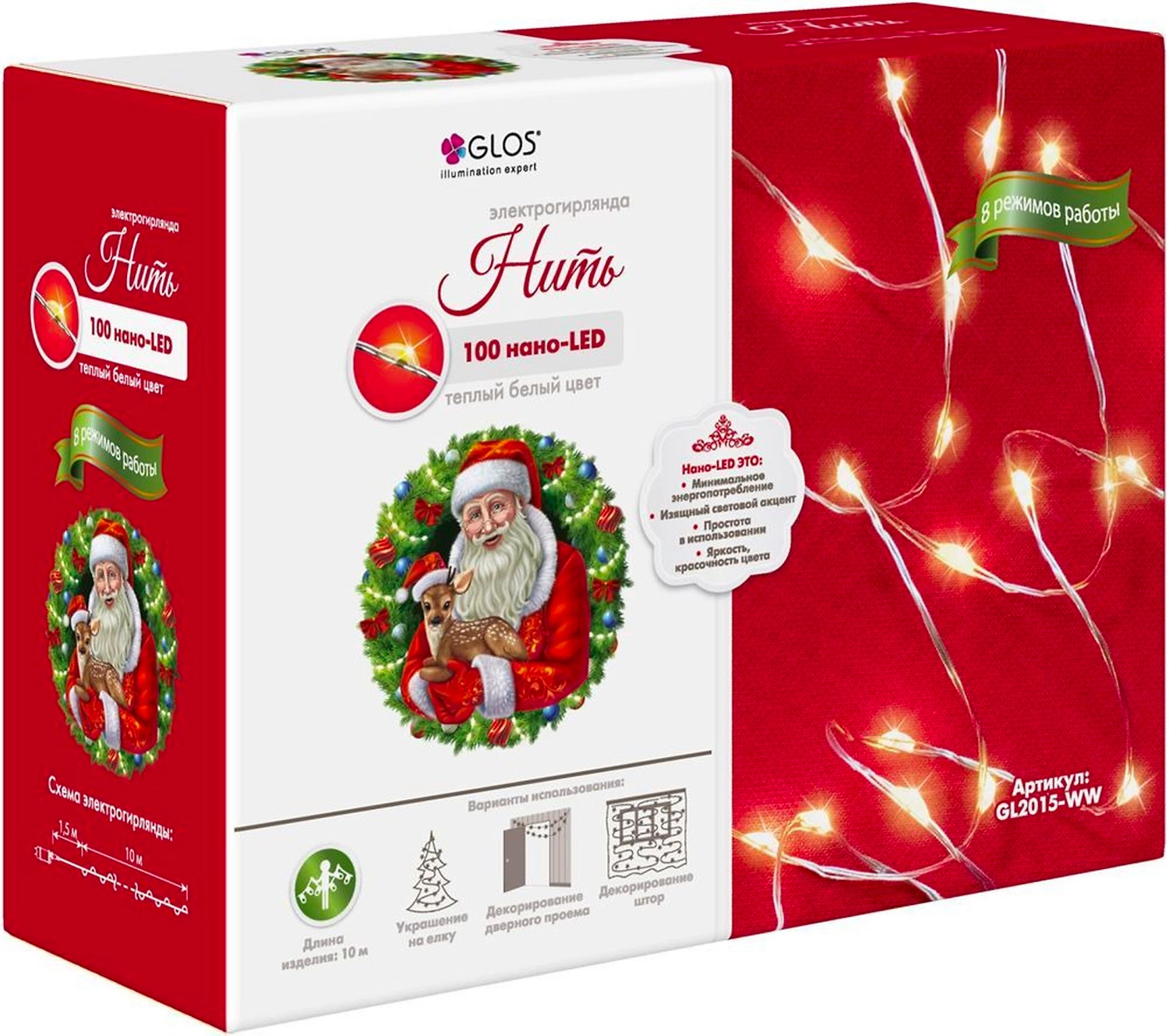 Гирлянда Нить Glos длиной 10 м состоит из 100 сверкающих нанодиодов с теплым белым свечением. Миниатюрные светодиоды работают в восьми разных режимах, создают элегантный световой акцент в праздничном оформлении интерьера.