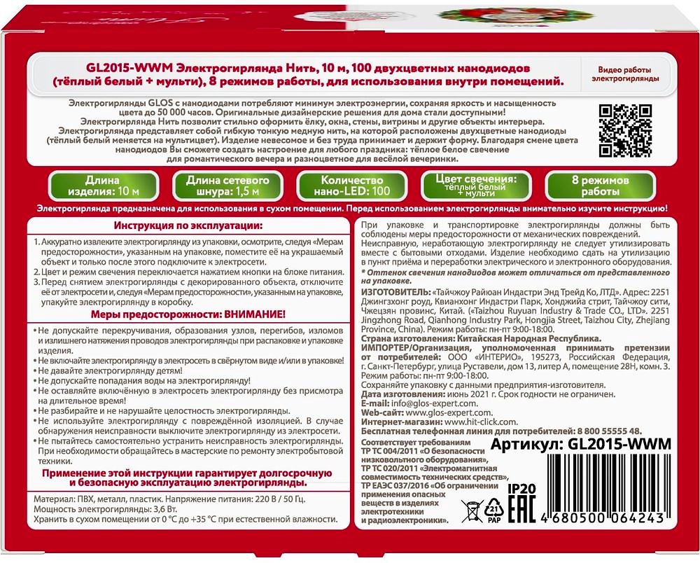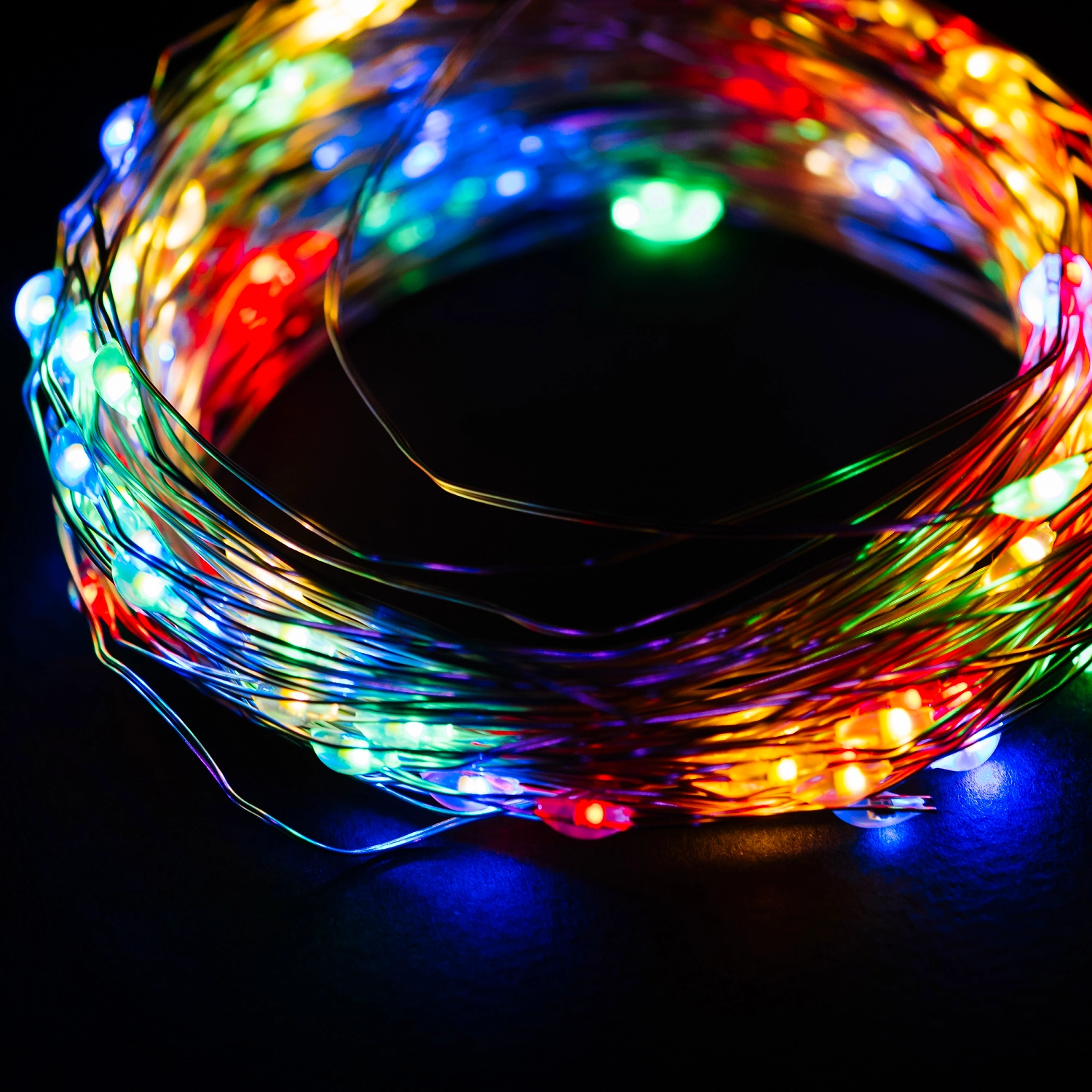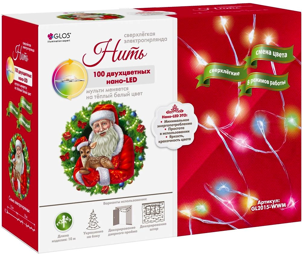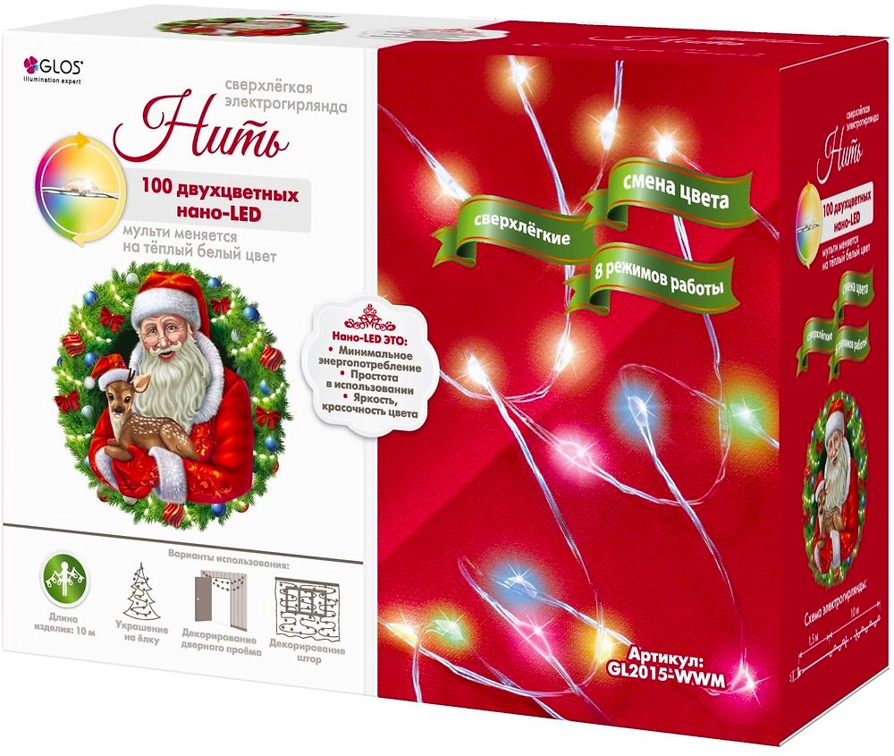 Гирлянда Нить Glos длиной 10 м состоит из 100 нанодиодов, свечение которых меняется с многоцветного на теплый белый. Яркие, красочные лампочки создают элегантный световой акцент в праздничном оформлении интерьера.
