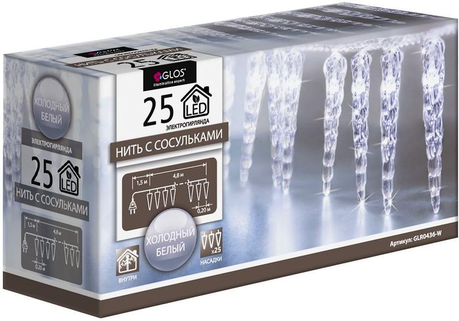 Гирлянда нить Glos Сосульки 25 LED холодный белый 4,8 м