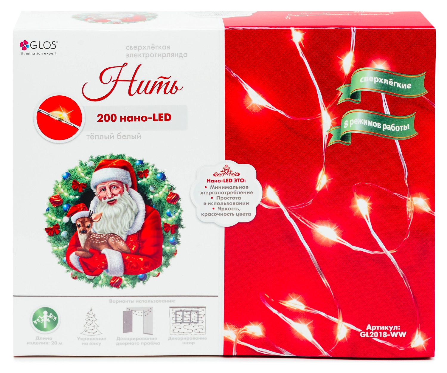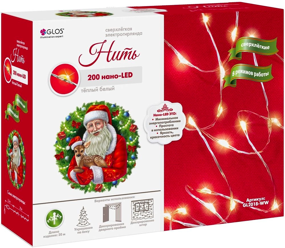 Гирлянда Glos длиной 20 м - тонкая гибкая медная нить, на которой закреплены 200 нанодиодов с теплым белым свечением. Яркие лампочки работают в восьми режимах, создают элегантный световой акцент в праздничном оформлении интерьера.