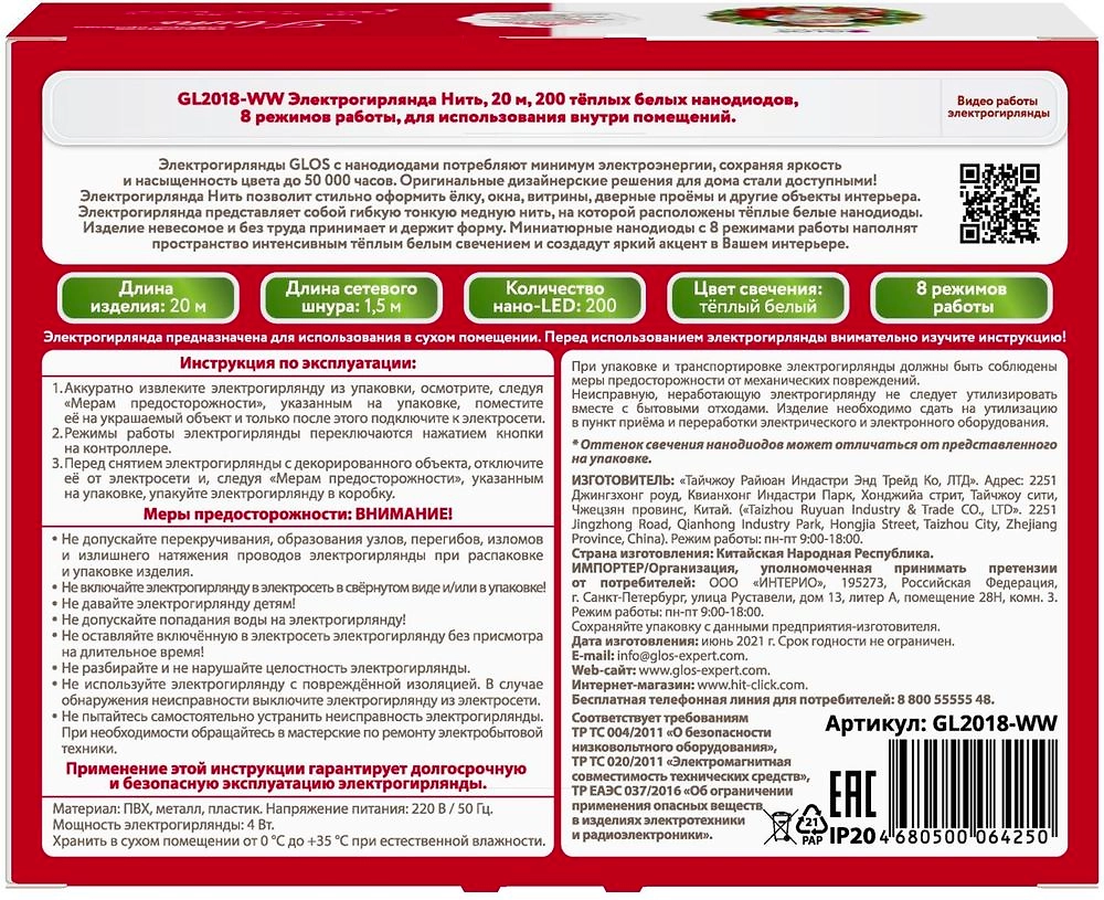 Гирлянда нить Glos теплый белый 20 м