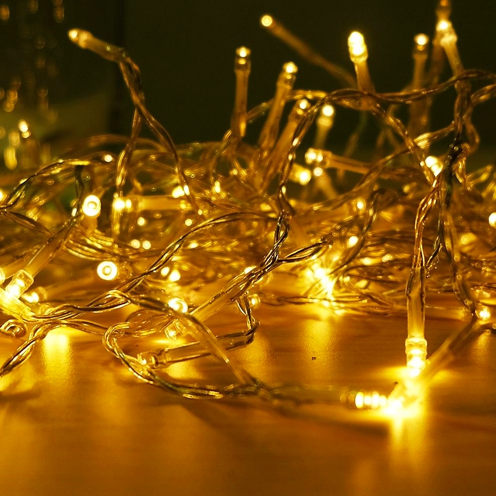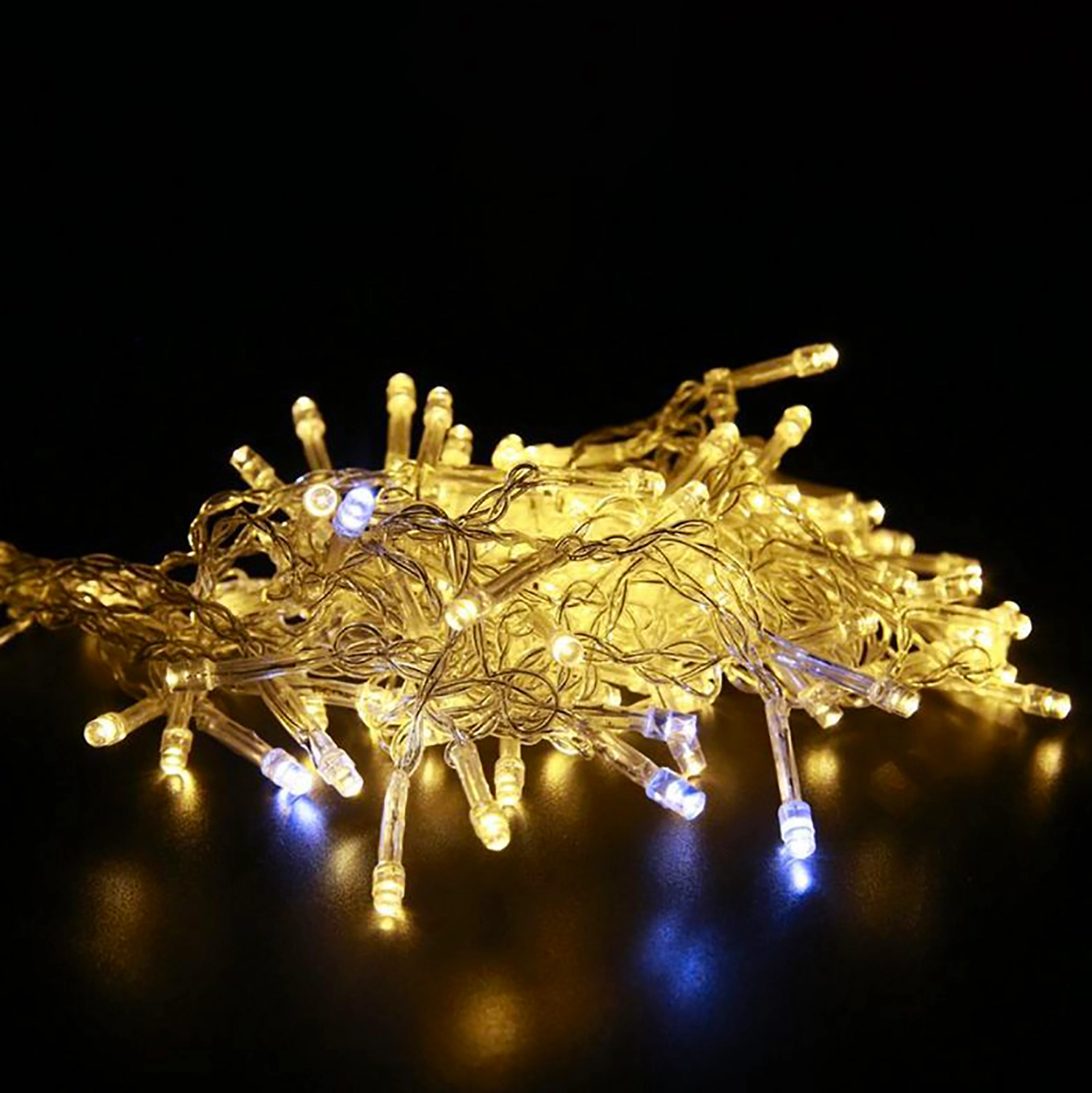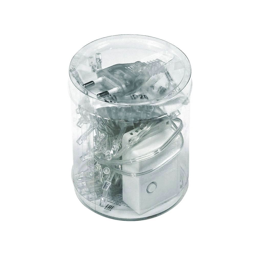 Новогодняя гирлянда Нить 5 метров. 100 тепло-белых и мерцающих белых светодиодов. Сетевой провод 1,5 м. Общая длина 6,5 м. Прозрачный провод. Для использования внутри помещения.