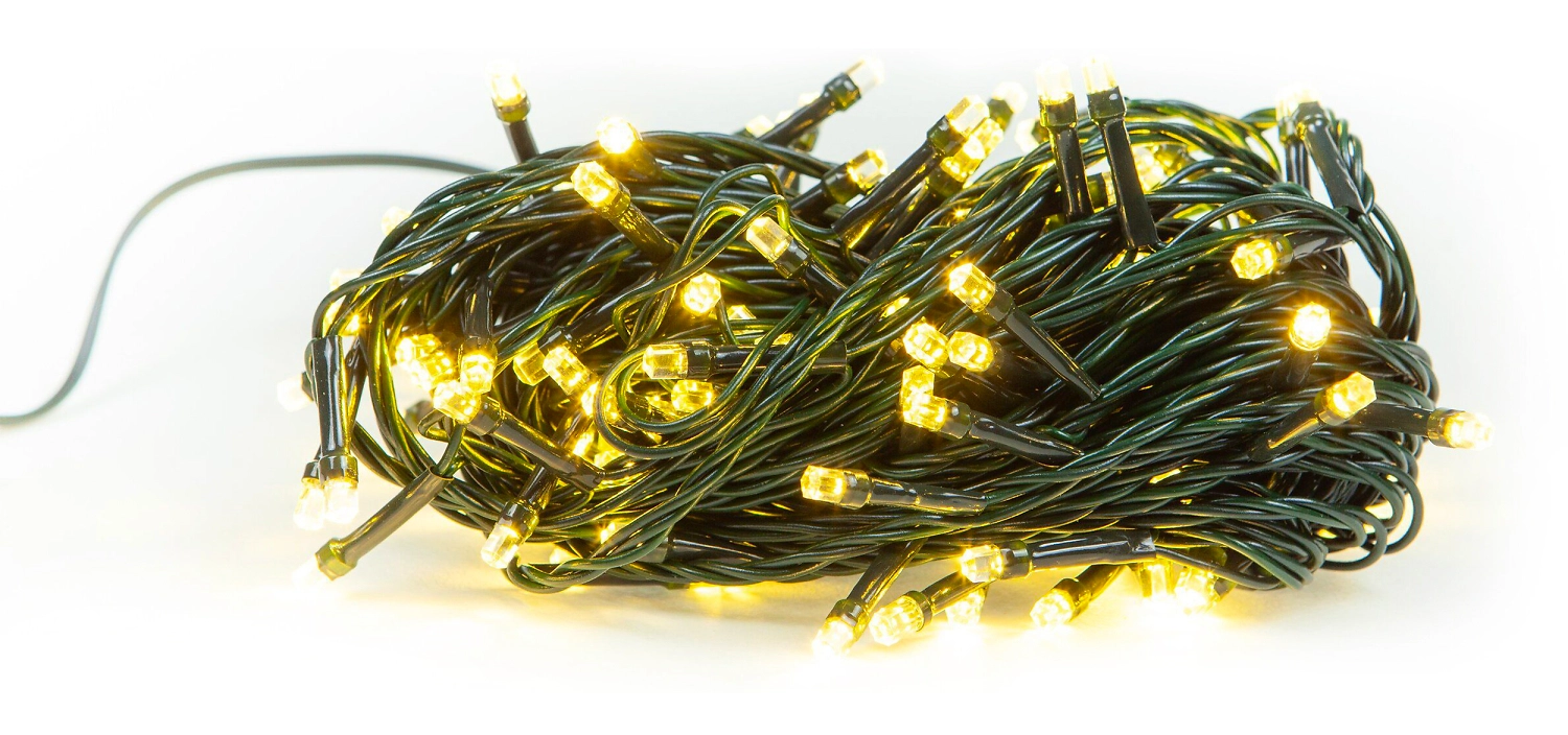 Новогодняя гирлянда с золотыми светодиодами идеальна для украшения елочек. С помощью такой декоративной подсветки можно также декорировать стену или потолок, витрину или камин в загородном доме.