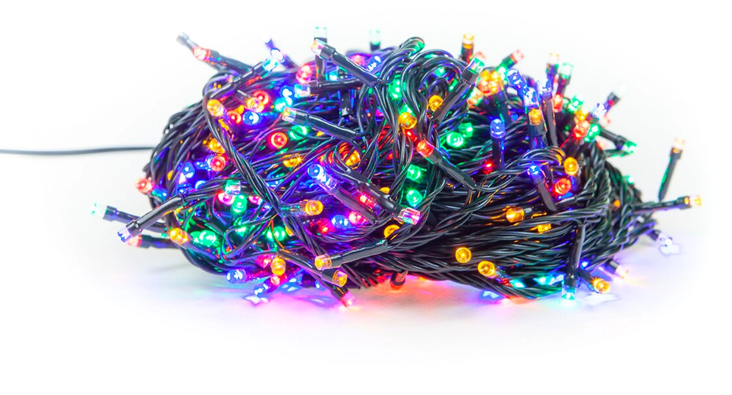Гирлянда имеет 400 светодиодных ламп закрепленных на темно-зеленом проводе, который практически не заметен в темноте.