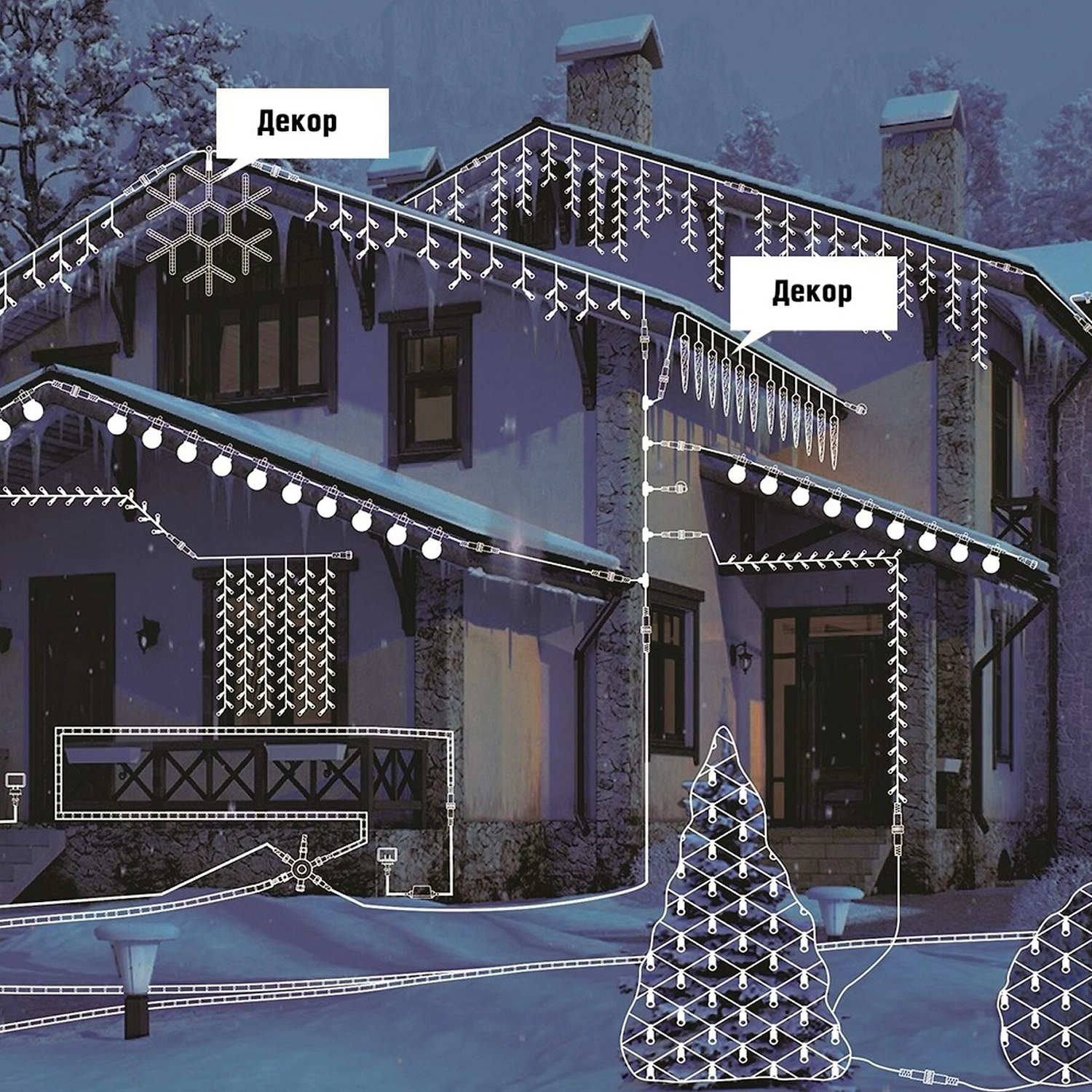 Светодиодная гирлянда будет хорошо смотреться на фасаде вашего загородного коттеджа. Кроме того, ее с успехом можно использовать внутри комнат, над каминной полкой или в оконном проеме. Гирлянда с большими лампочками может эффектно украсить высокую новогоднюю ель на улице или дома. БП в комплект не входит.