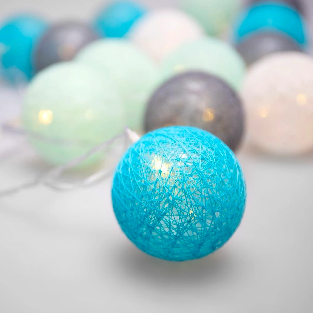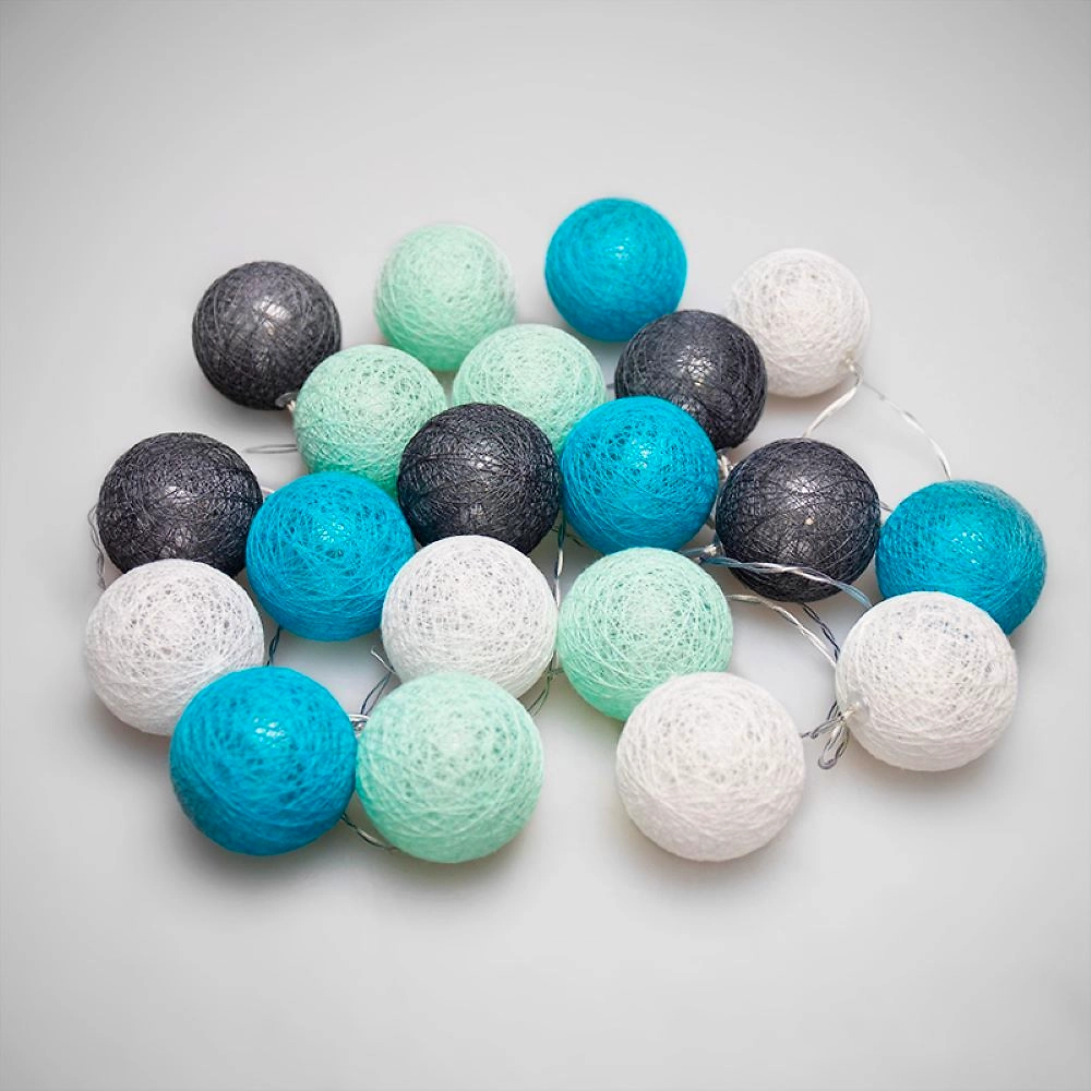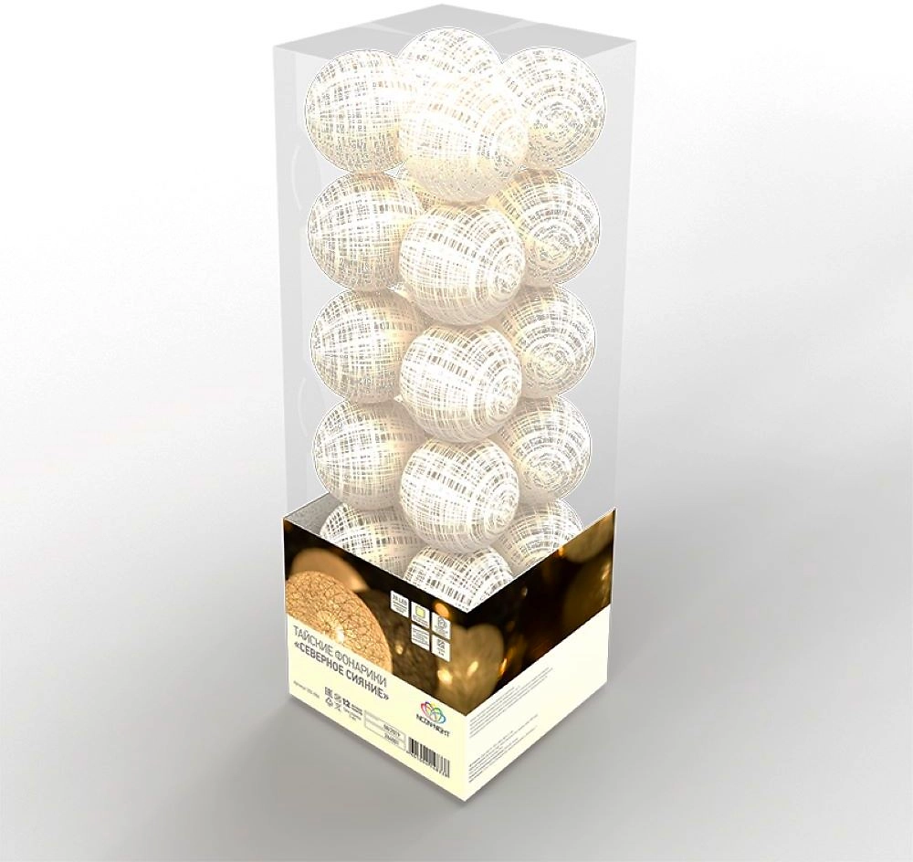 Тайские фонарики Северное сияние - светодиодная интерьерная гирлянда длиной 3,5 метра, которая имеет необычное, оригинальное оформление. 20 волшебных фонариков, выполненных из хлопковых нитей, располагаются на серебристом кабеле в прозрачной ПВХ-изоляции. Текстильные декоративные элементы, мягко подсвечиваемые изнутри белыми диодами, станут стильным украшением любой обстановки. Гирлянда получает питание от двух батареек АА, которые размещаются в специальном блоке на конце кабеля. Изделия с батарейками можно размещать даже в детских комнатах благодаря повышенной безопасности.