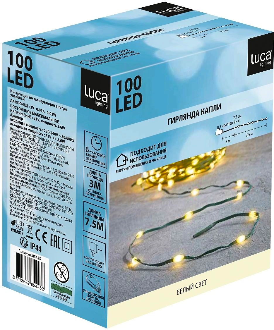 Гирлянда String light капли  белый свет 100 ламп, 8 функций, длина 750 см
