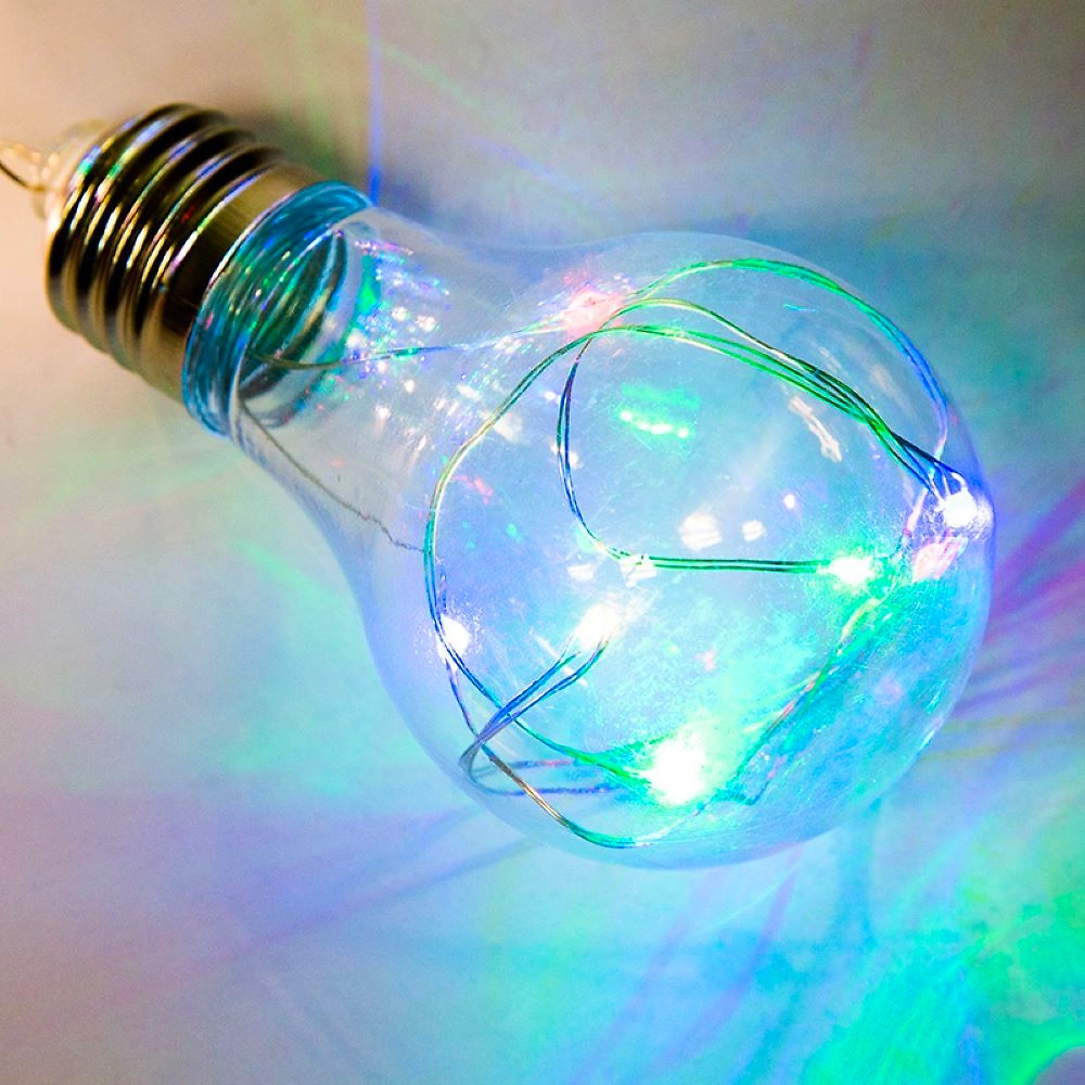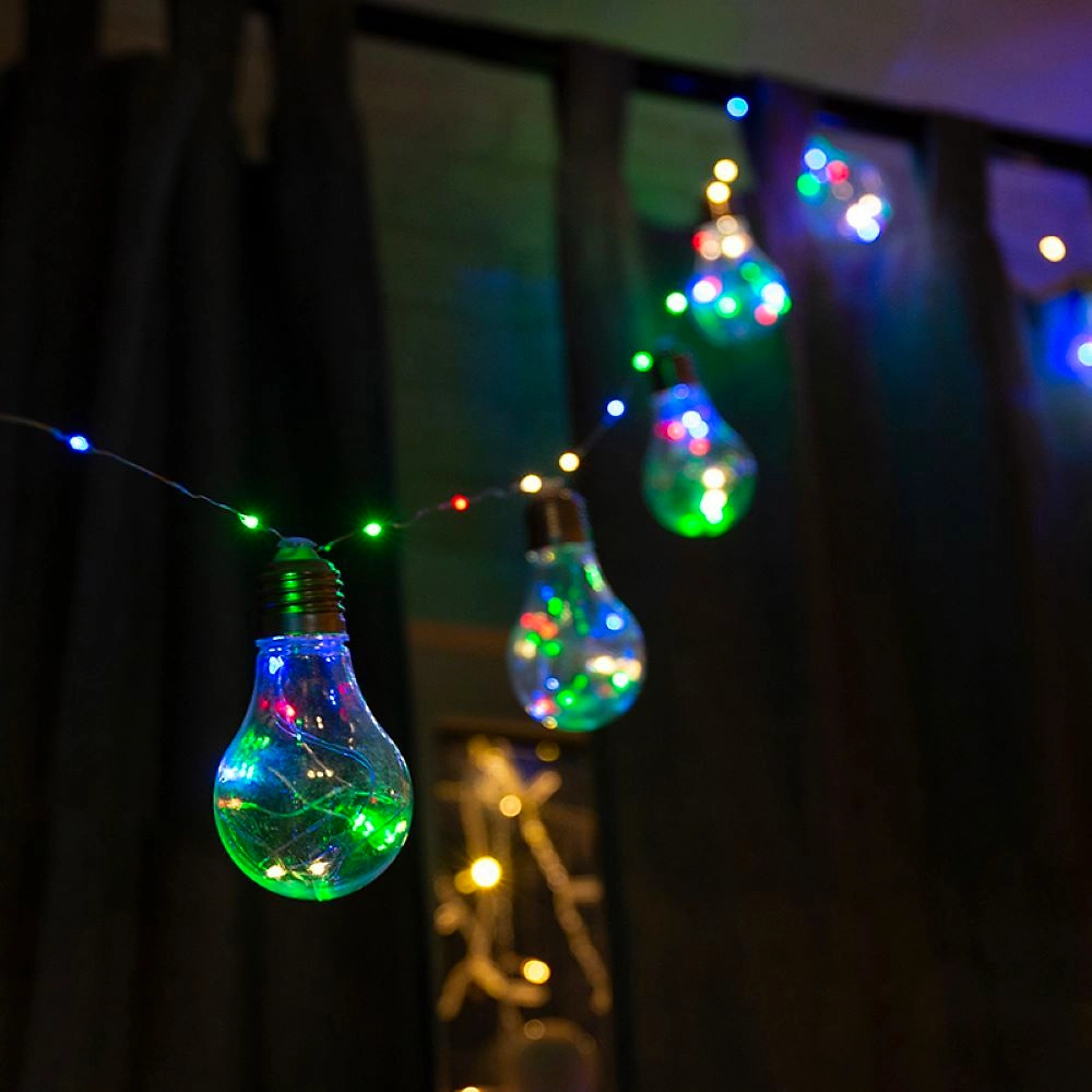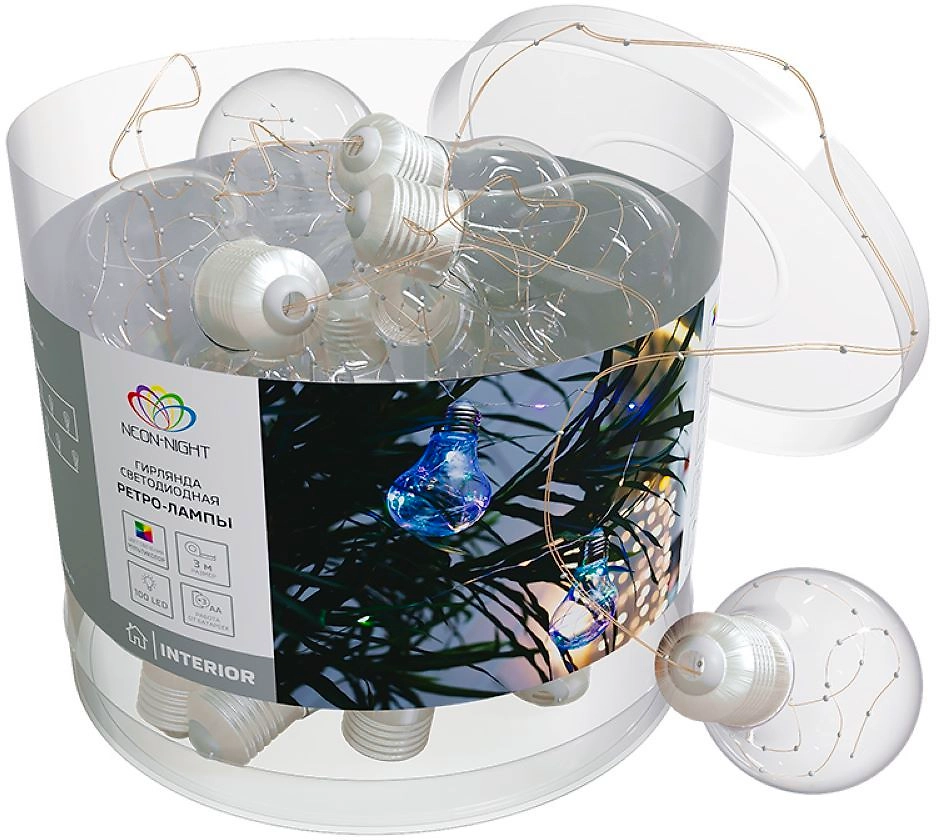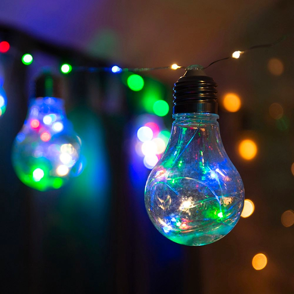 Гирлянда «Ретро-лампы» длиной 3 метра — необычное, стильное интерьерное украшение, которое разнообразит обстановку не только в новогодние праздники, но и в будни. Изделие представляет собой гибкий шнур, на котором находятся 100 диодов, светящихся разноцветными огнями. Дополнительно на кабеле расположены 10 насадок в виде аутентичных ламп накаливания с серебристым цоколем, эффектно подсвечиваемые диодами изнутри. Гирлянда не нуждается в подключении к стандартной электросети: питается от 3 батареек типа АА, что говорит об абсолютной безопасности использования.